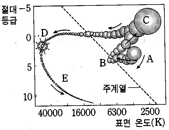 2)오른쪽 그림 B~C 과정에서 헬륨핵융합반응이 일어난다고 하고, 또 다른 자료에는 C단계에 도달할때 헬륨핵융합반응이 일어난다합니다. 그림의 어느 단계부터를 적색 거성이라고 할까요?
