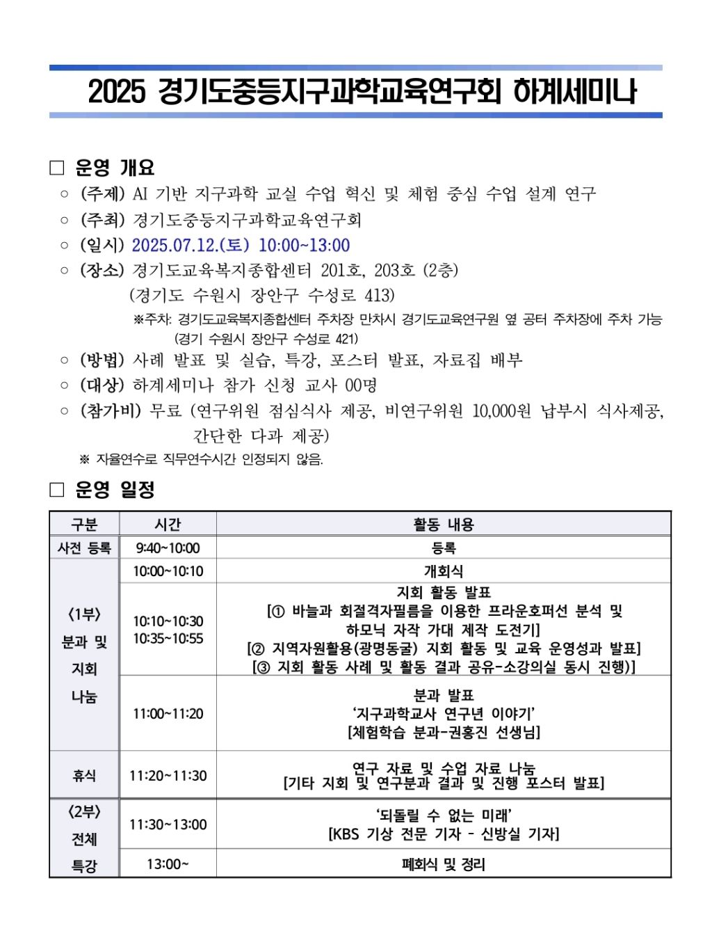 2025.07.12(토) 2025 경지교연 하계세미나 작성자안병선(부흥고)|작성시간25.07.18|조회수166 목록 댓글 0 글자크기 작게가 글자크기 크게가 2025년 경지교연 하계세미나가 지난 7월 12일(토) 경기도교육복지종합센터에서 거행되었습니다. 지회활동 발표와 기후위기 특강으로 진행된 이번 하계 세미나의 생생했던 모습을 올려봅니다. 다음검색 현재 게시글 추가 기능 열기 북마크 신고 센터로 신고 댓글 댓글 0 댓글쓰기 답글쓰기 댓글 리스트