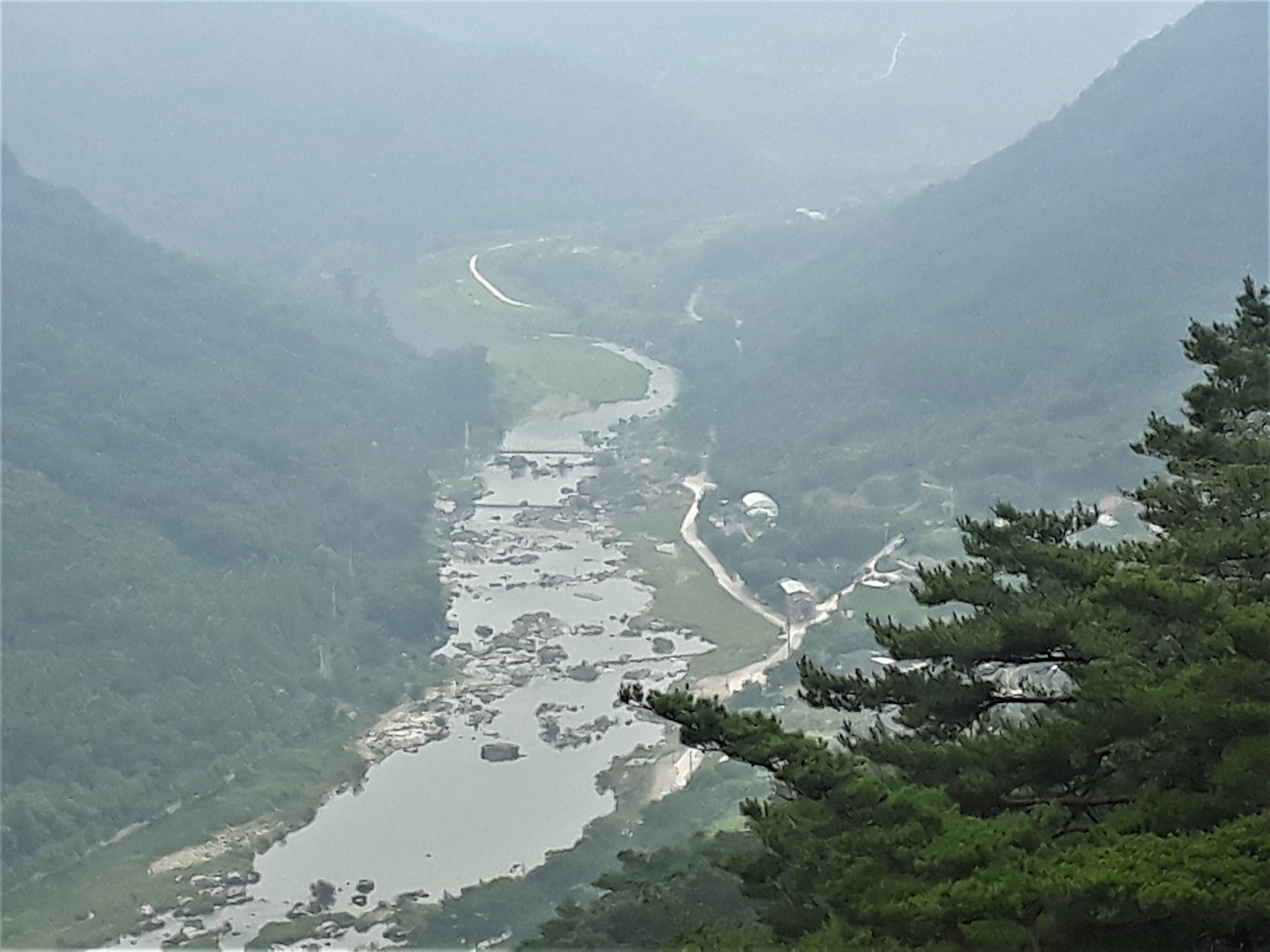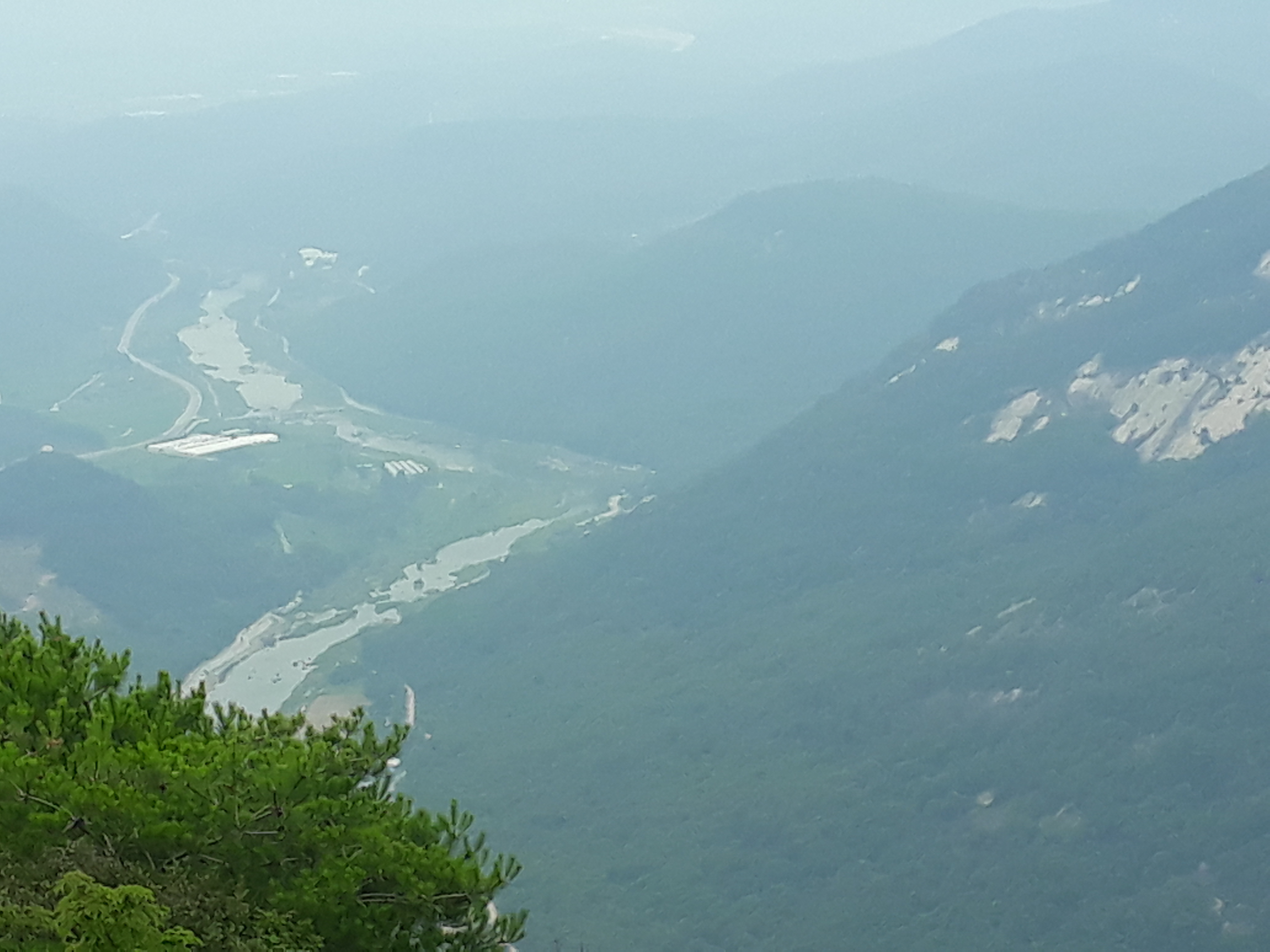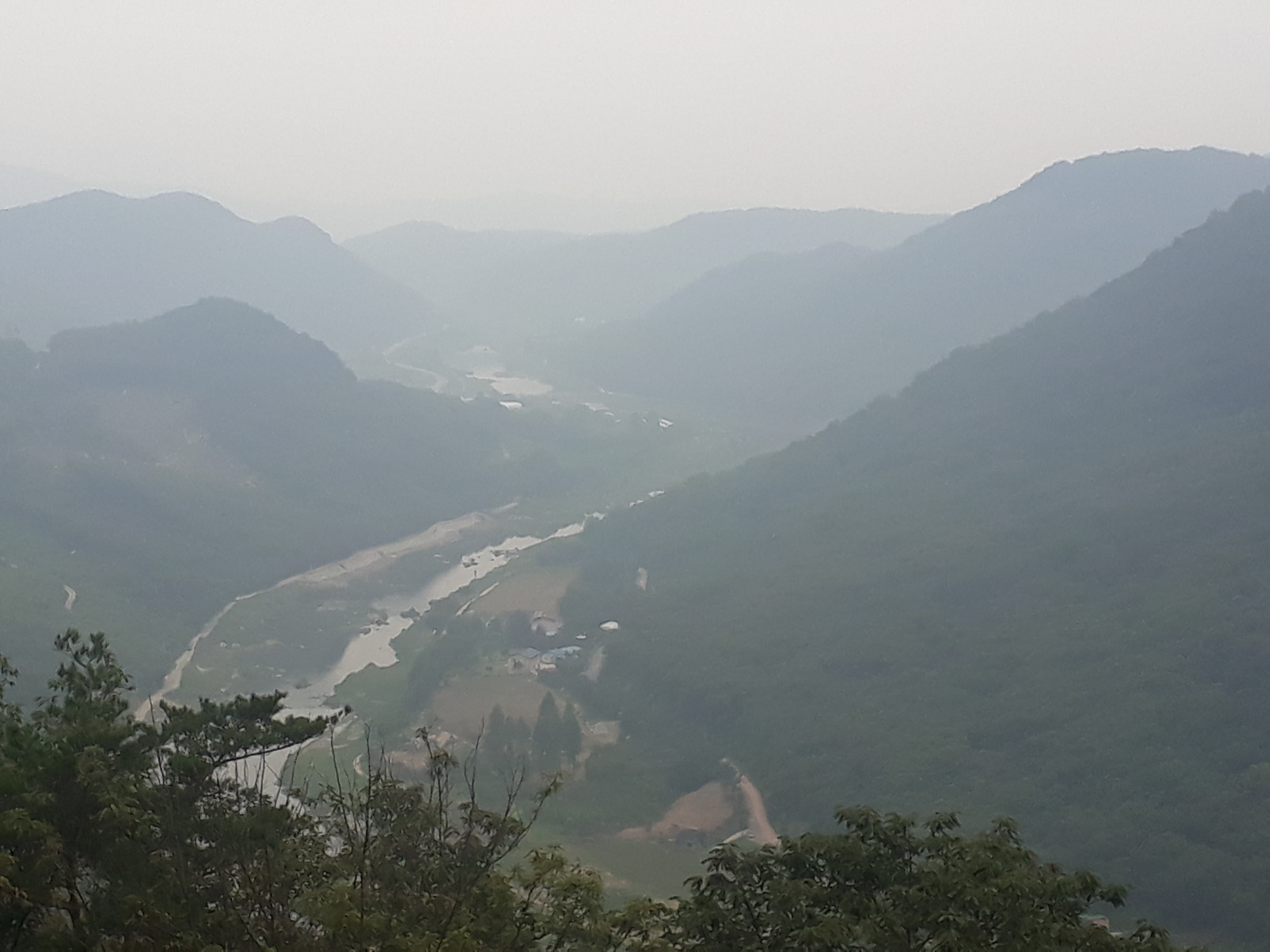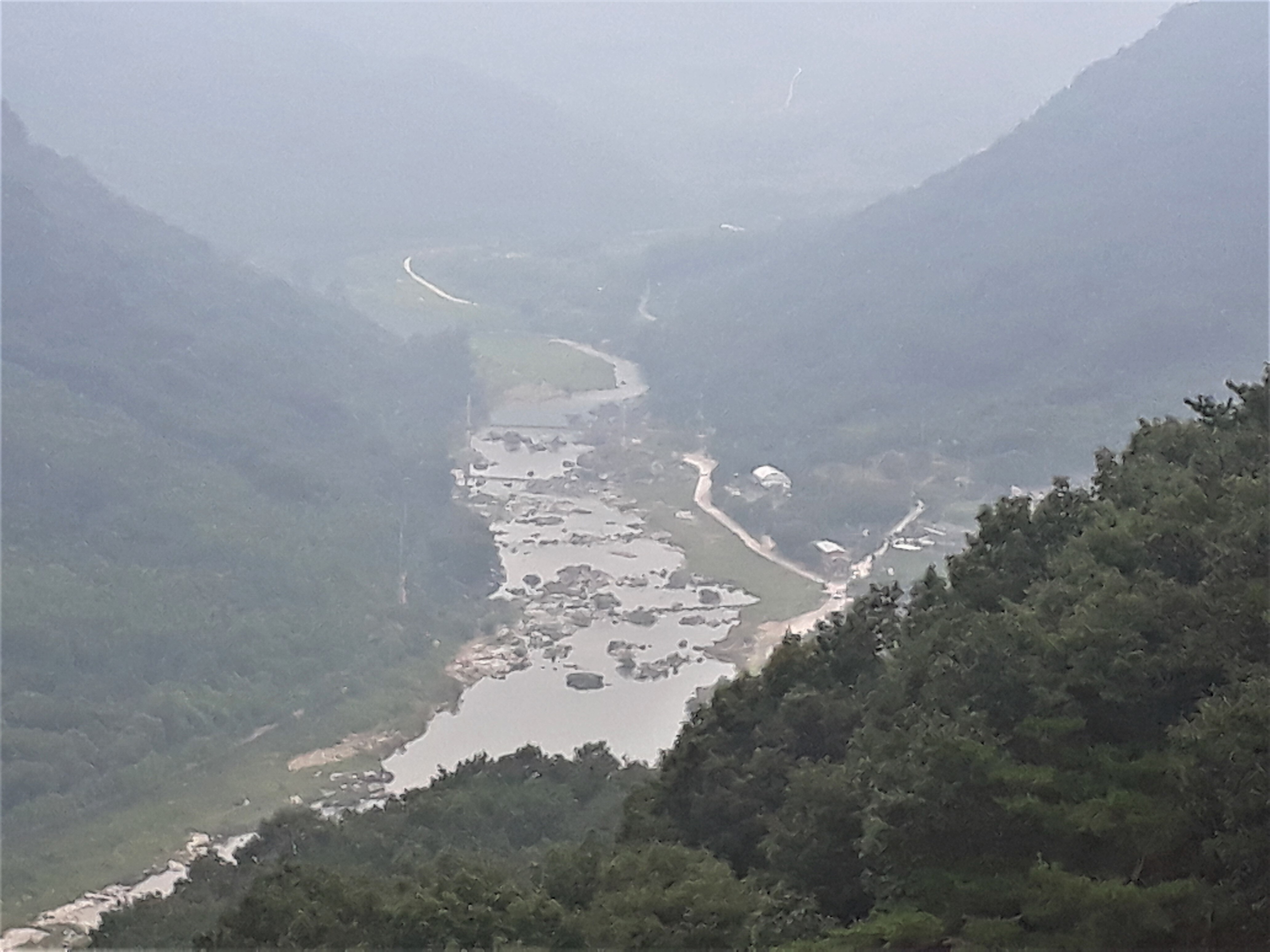 장군목(유원지)와 현수교가 있는 내룡마을이 보이지만 짙은 안개와 구름이 얄밉다.