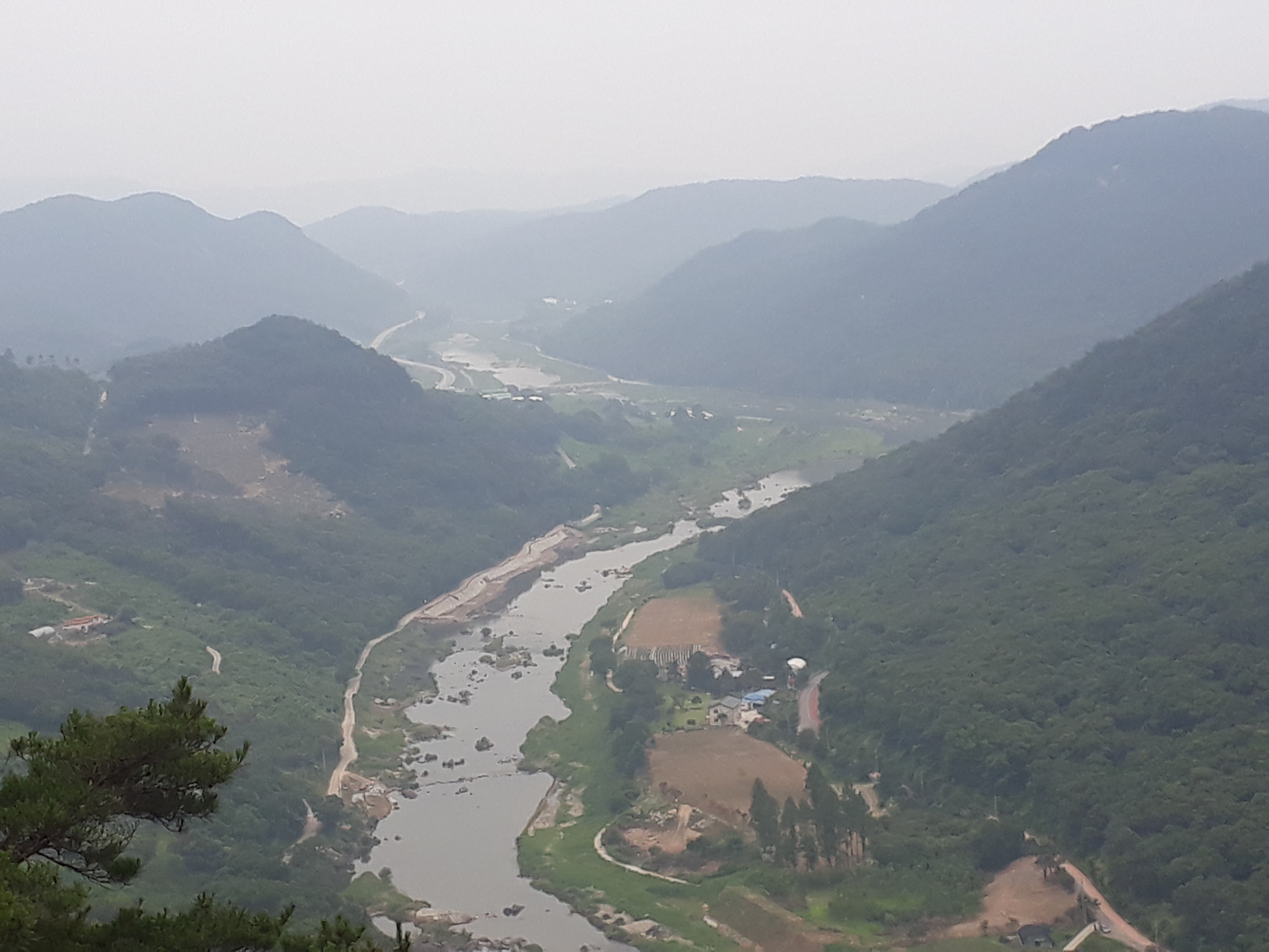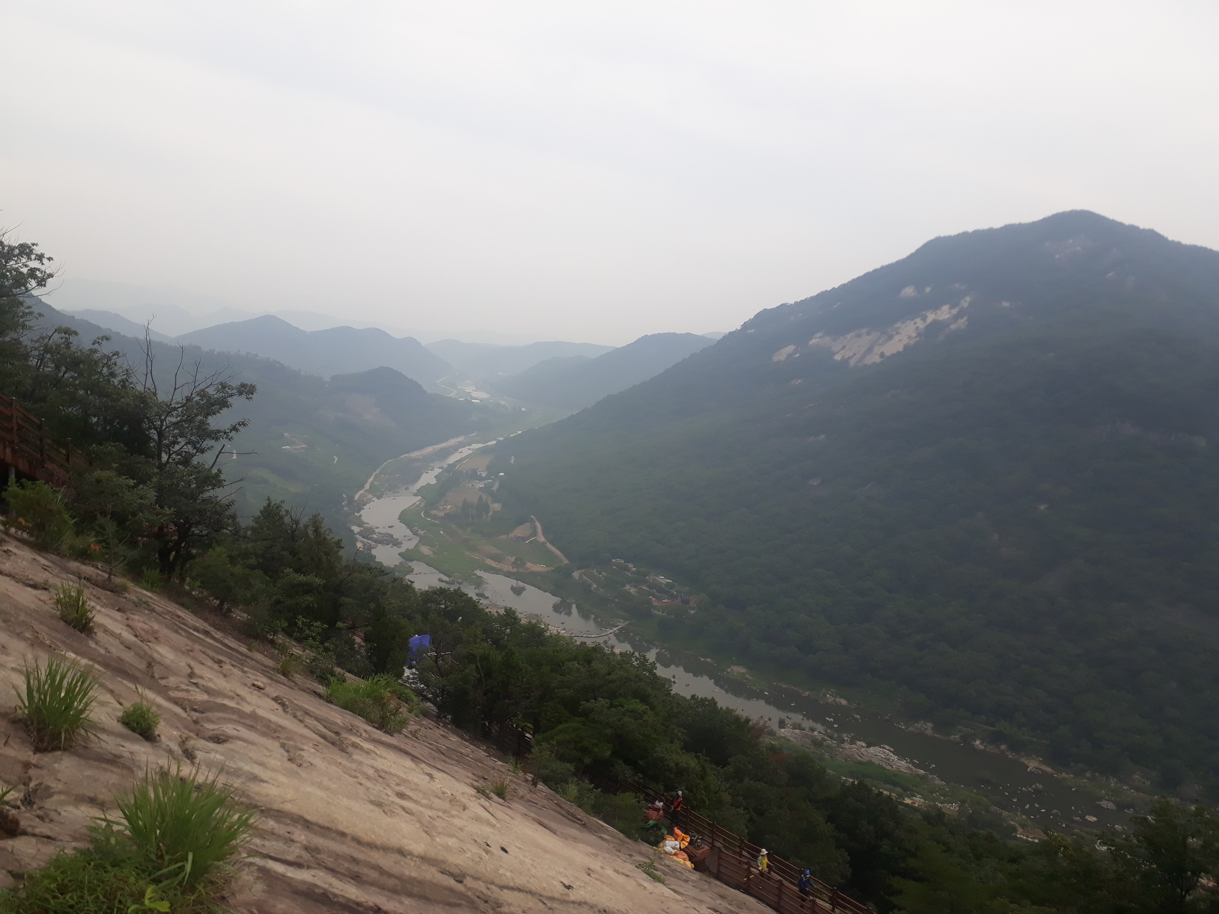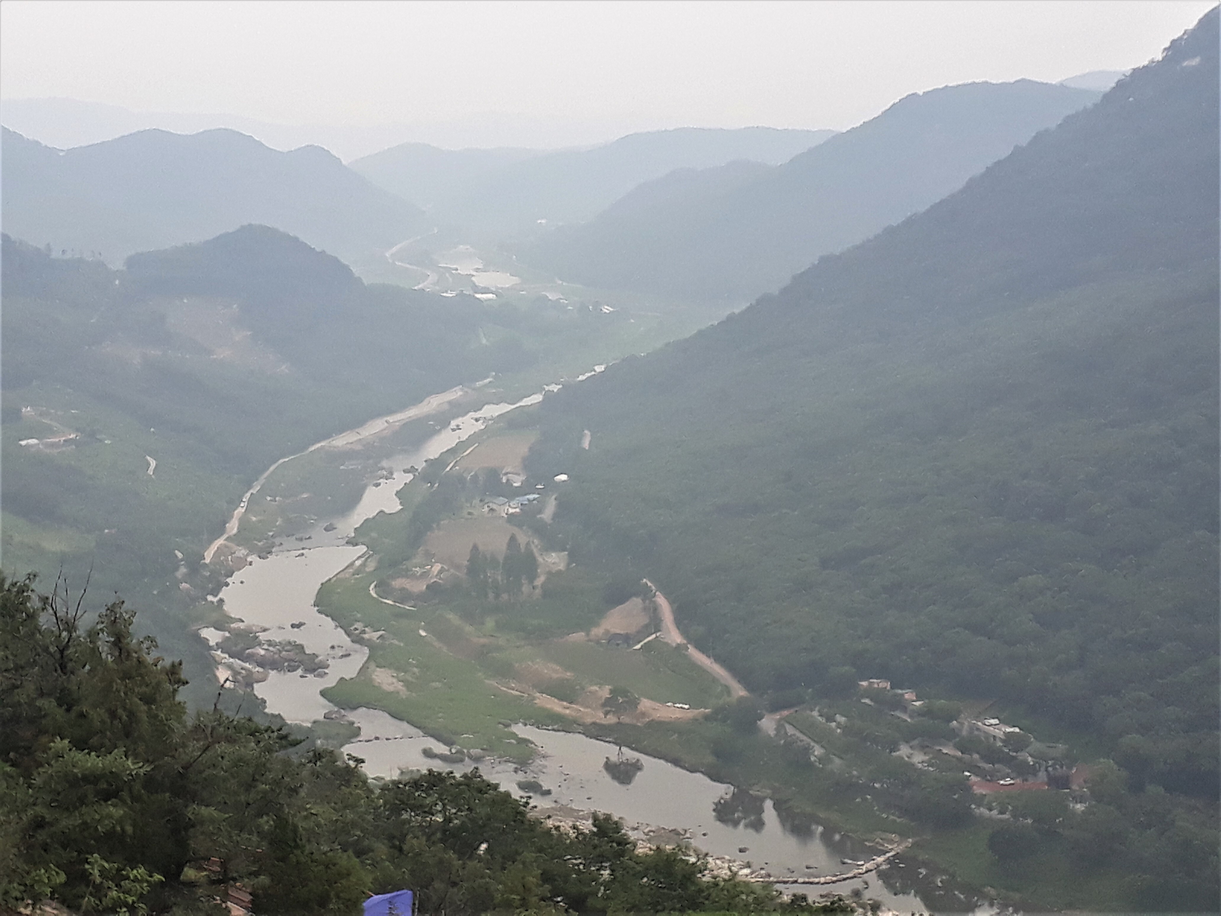 장군목(유원지)와 현수교가 있는 내룡마을이 보이지만 짙은 안개와 구름이 얄밉다.