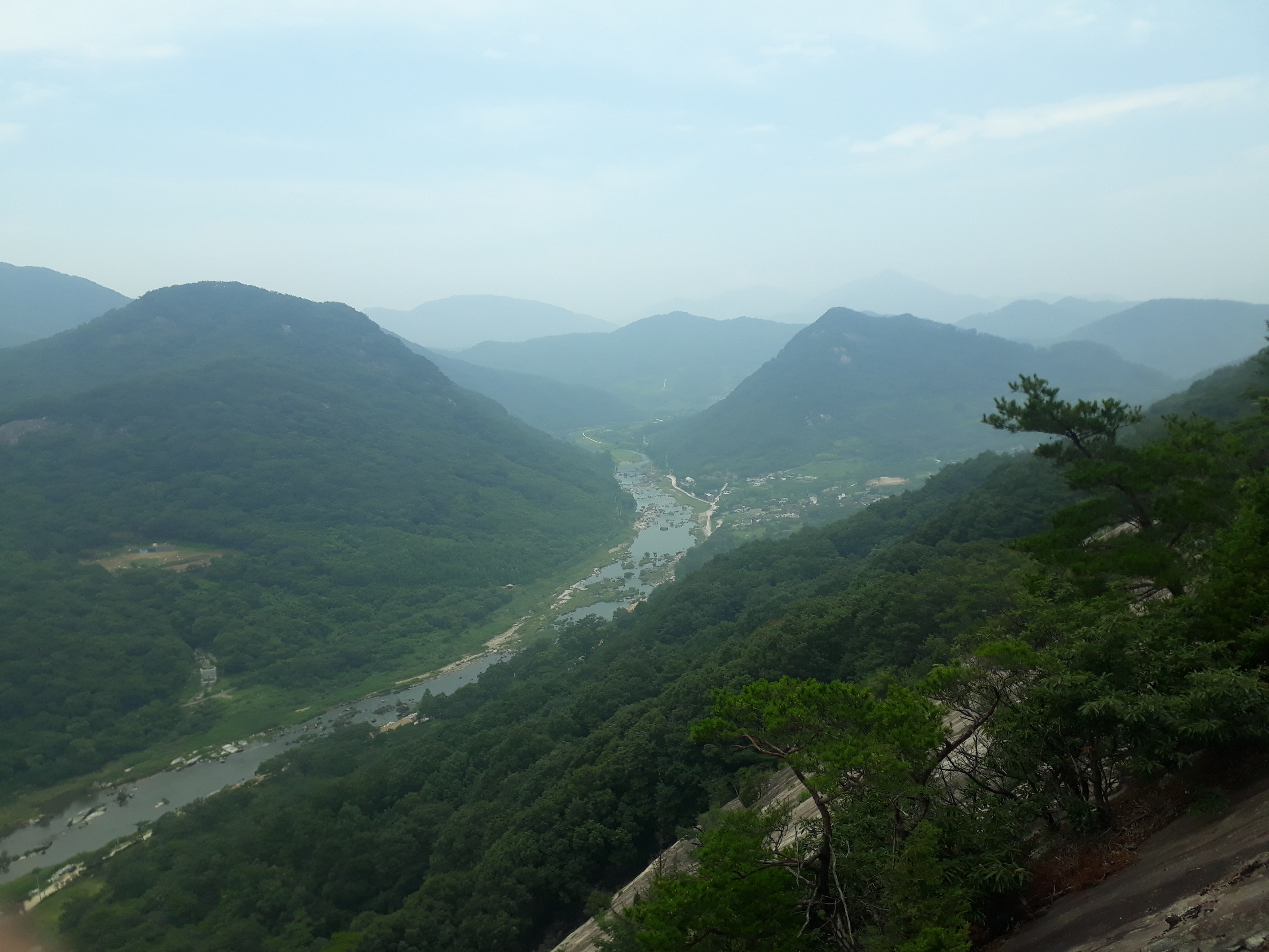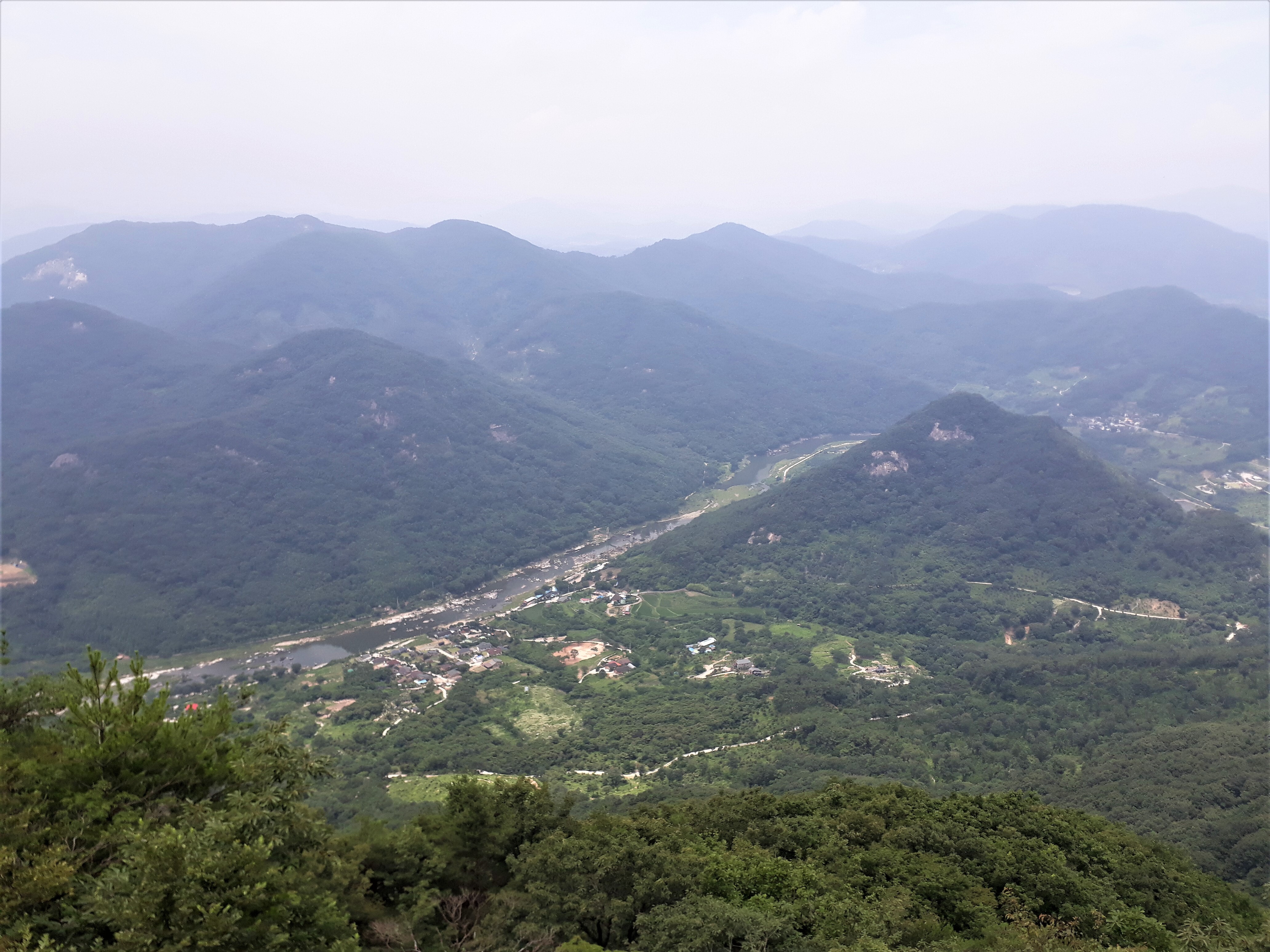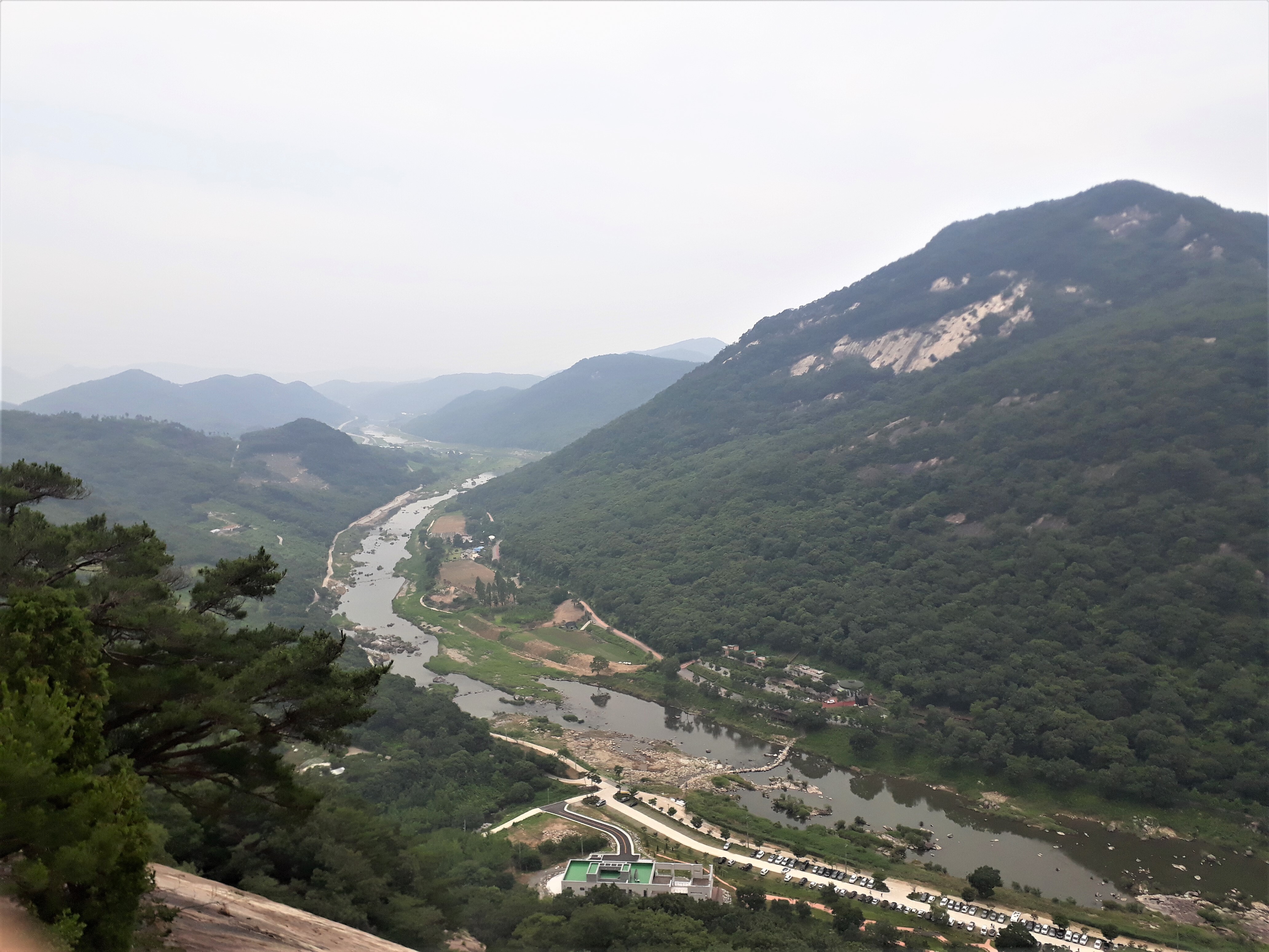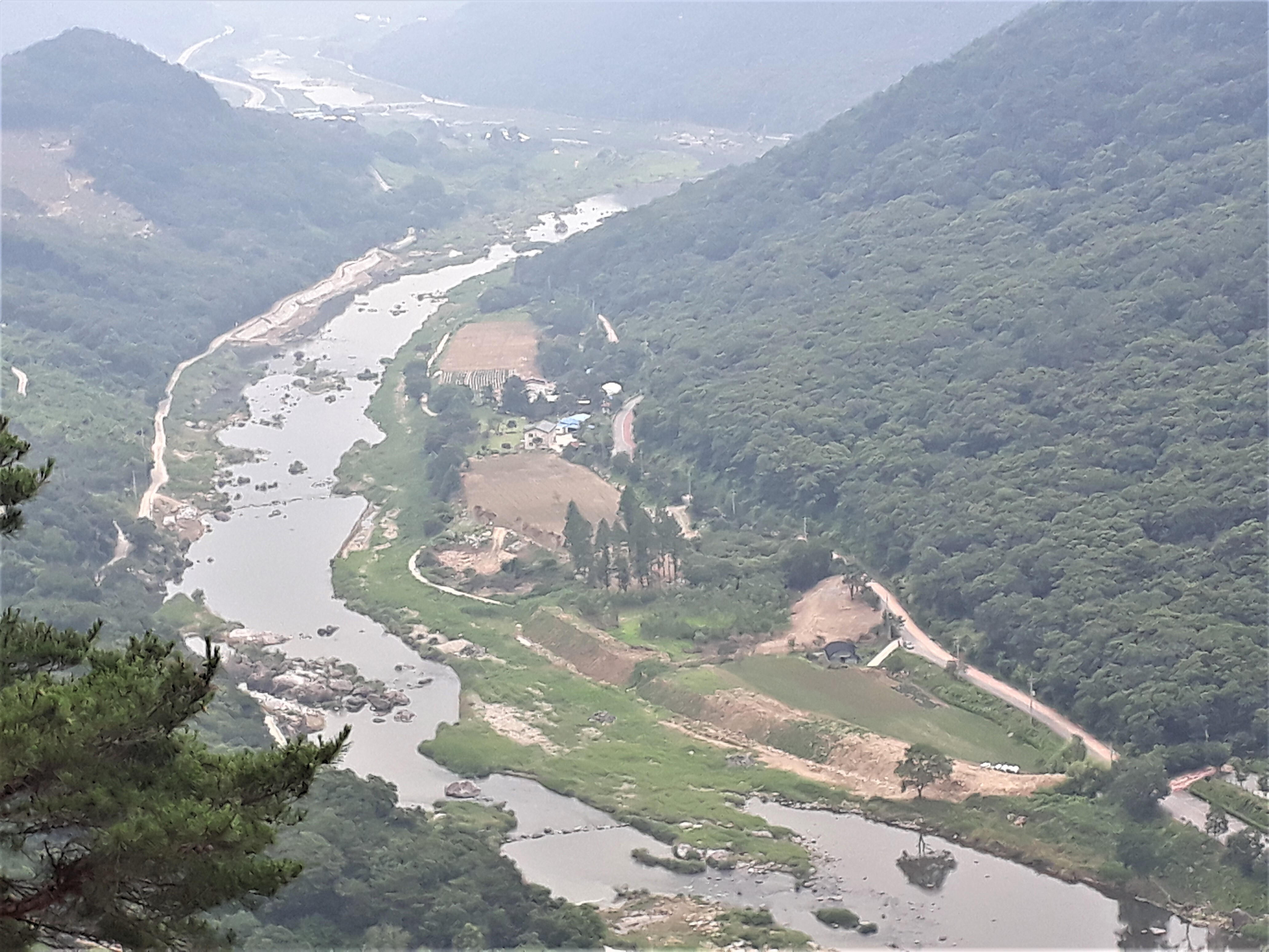 장군목(유원지)와 현수교가 있는 내룡마을이 보이지만 짙은 안개와 구름이 얄밉다.