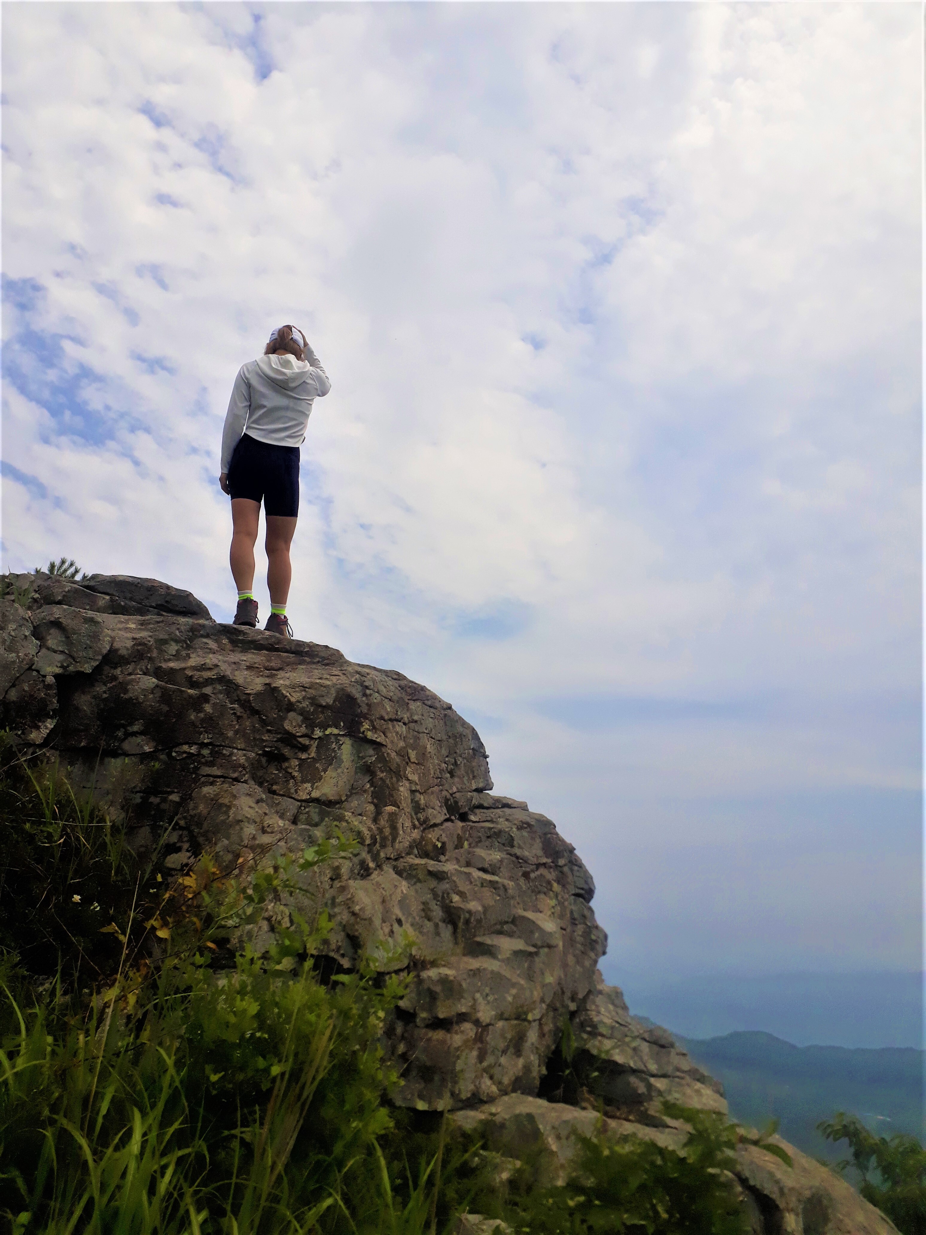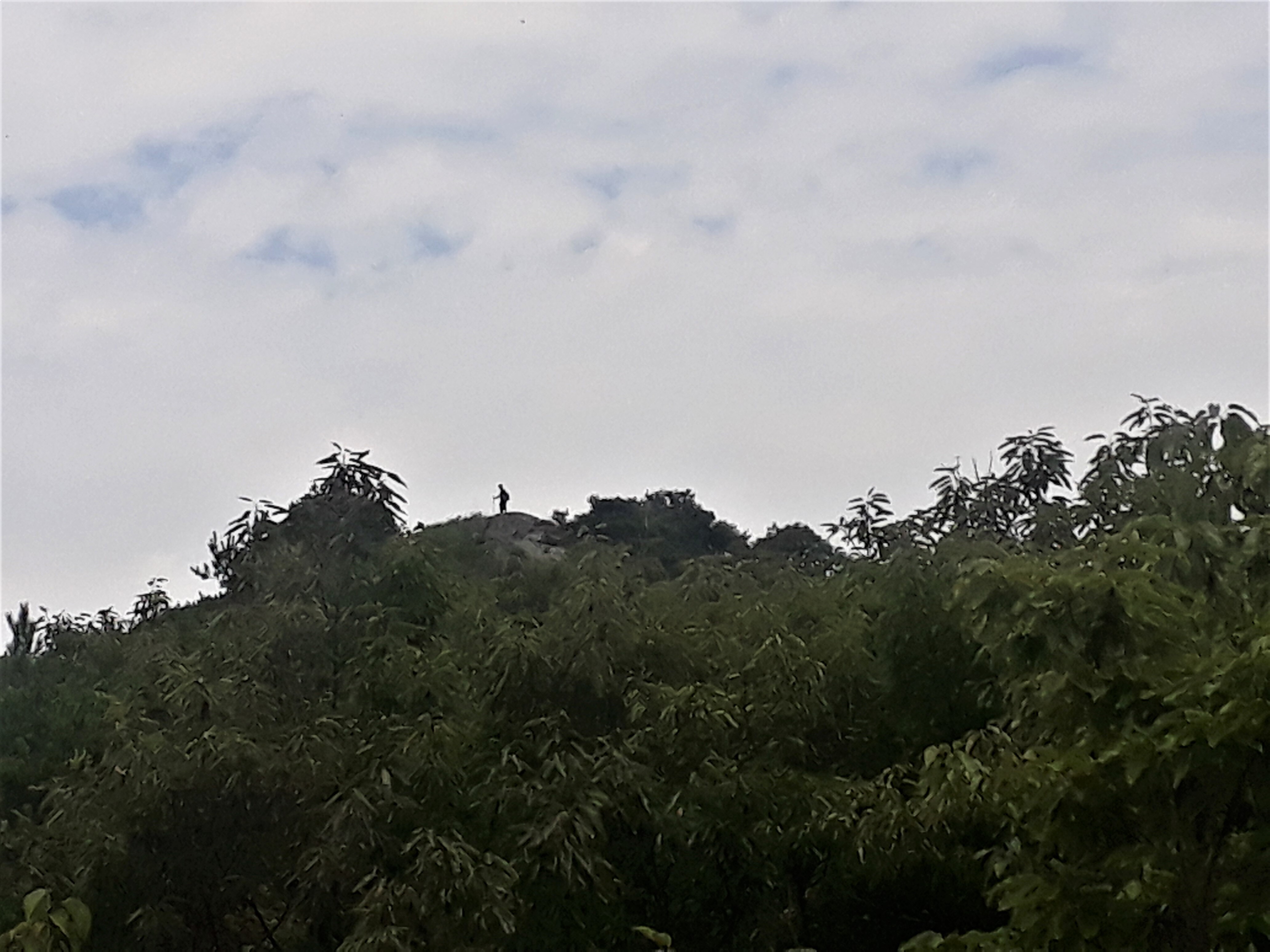 ▲시그널들이 펄럭이는 거암 위에 올라서서 건너 용궐산 정상의 산객 실루엣을 본다▼.