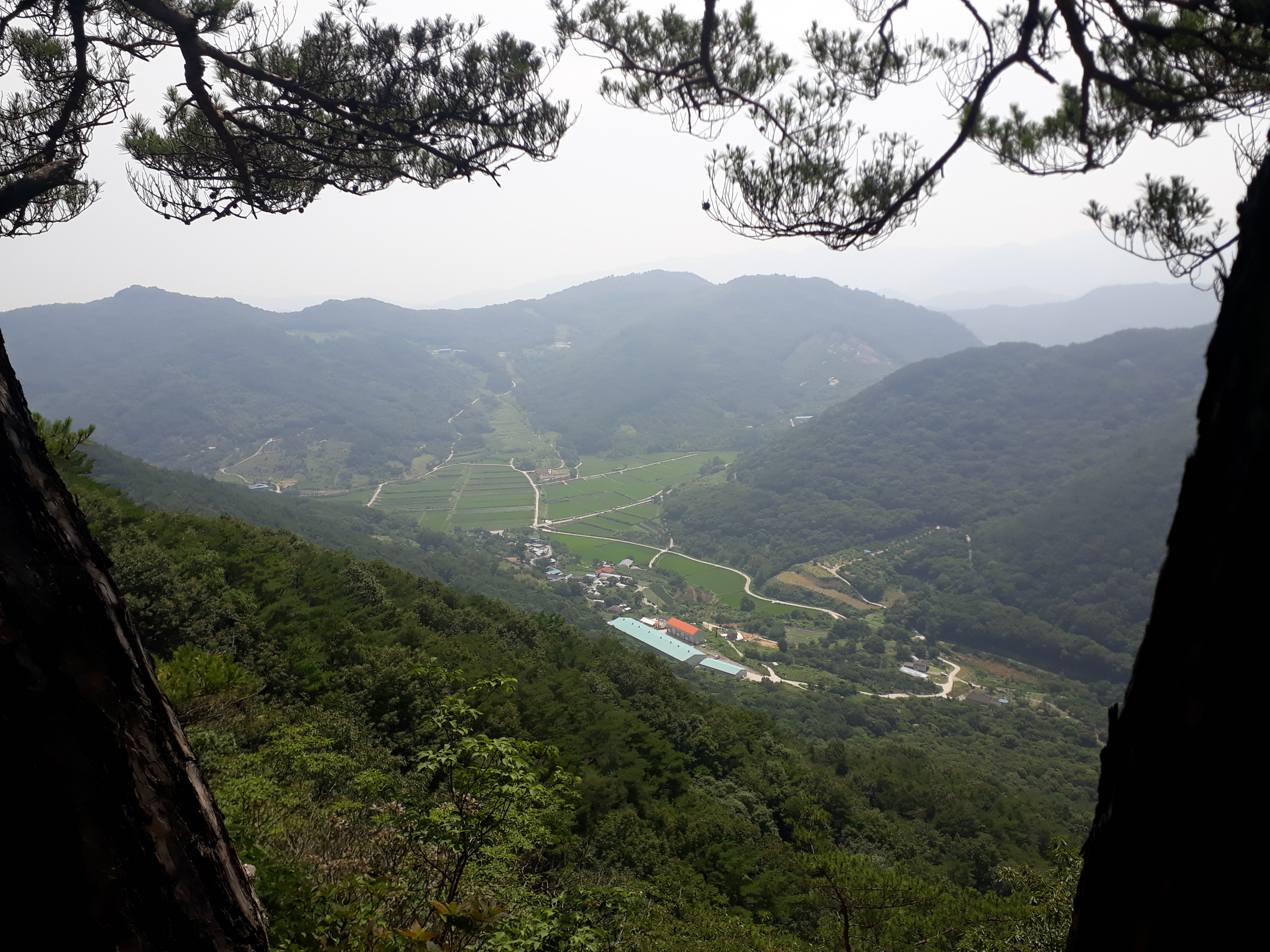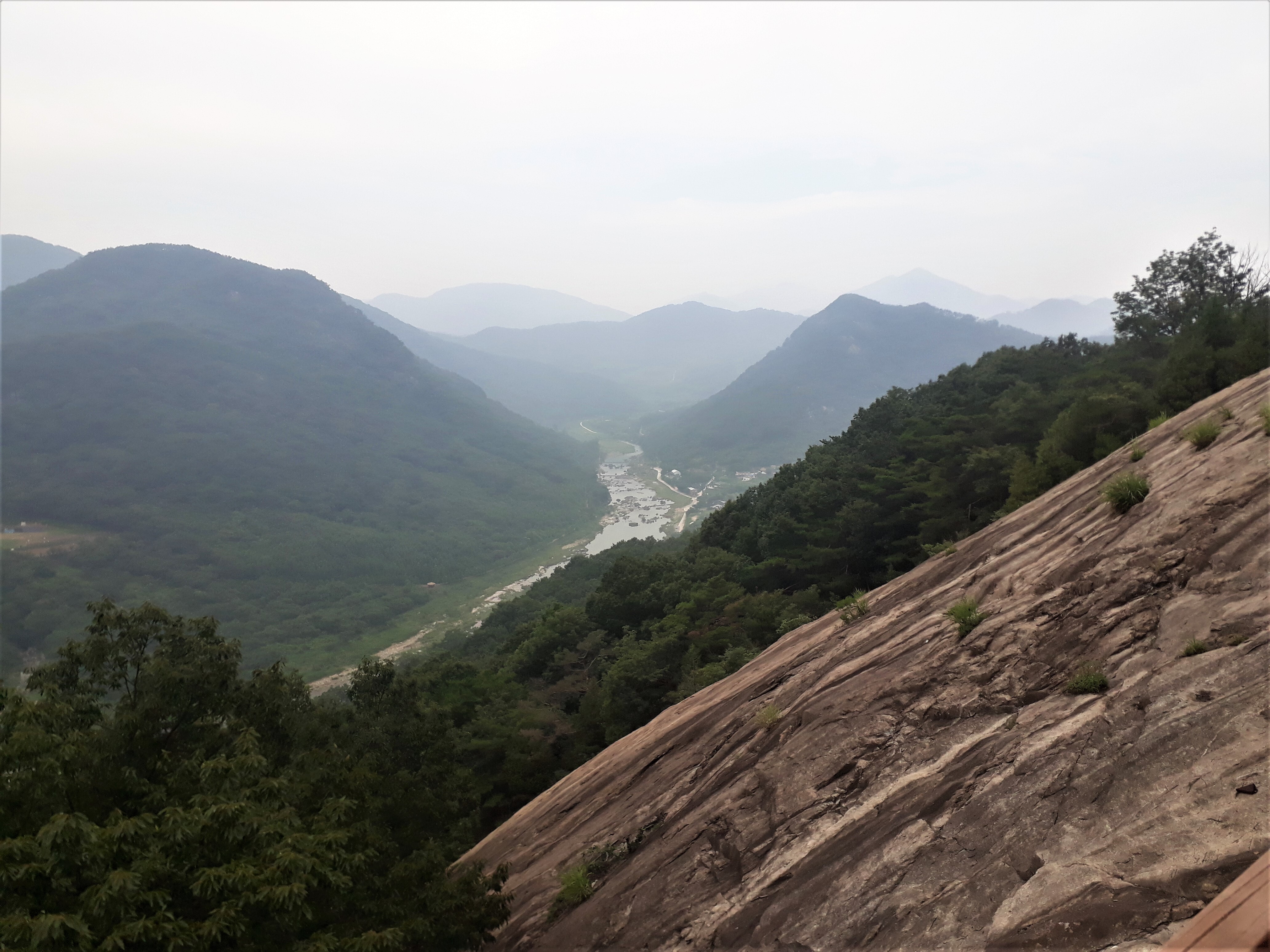 무너져 내릴 듯한 거대 암석아래의 전망대(데크와 벤치쉼터)에서 조망하는 산하 전경. 지리천왕봉이 보인다지만 오늘은.