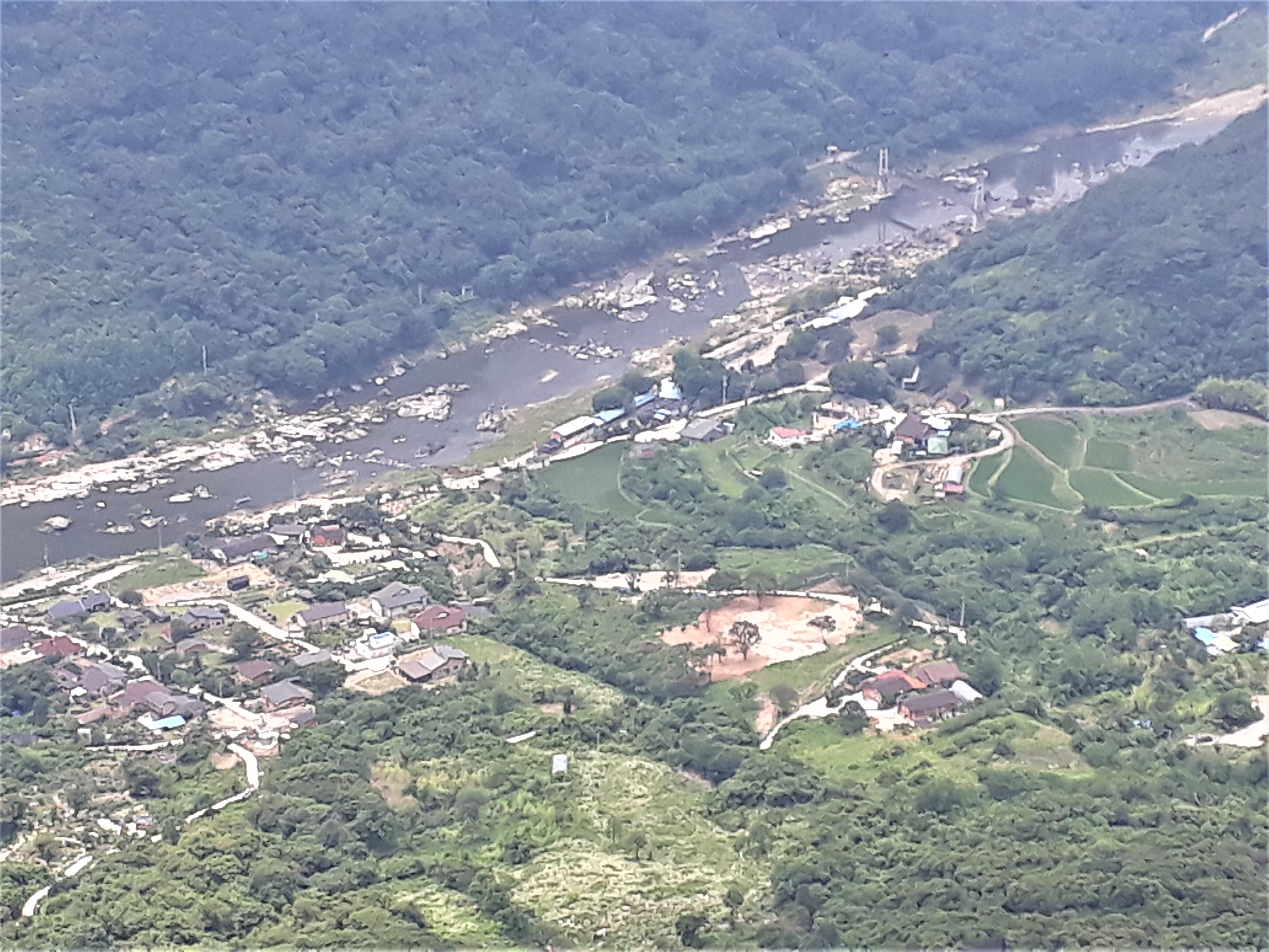 ▲산하 아래 주차장 일원과 어치리 주변 그리고 멀리 적성면 구미리▼
