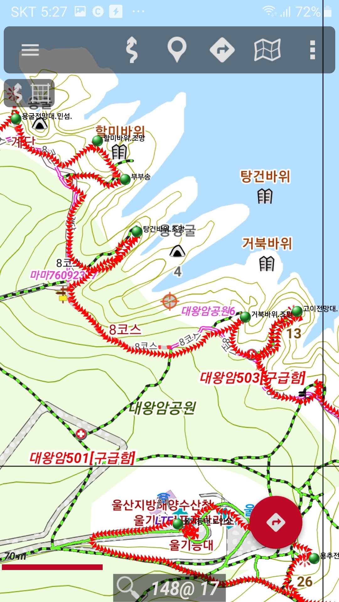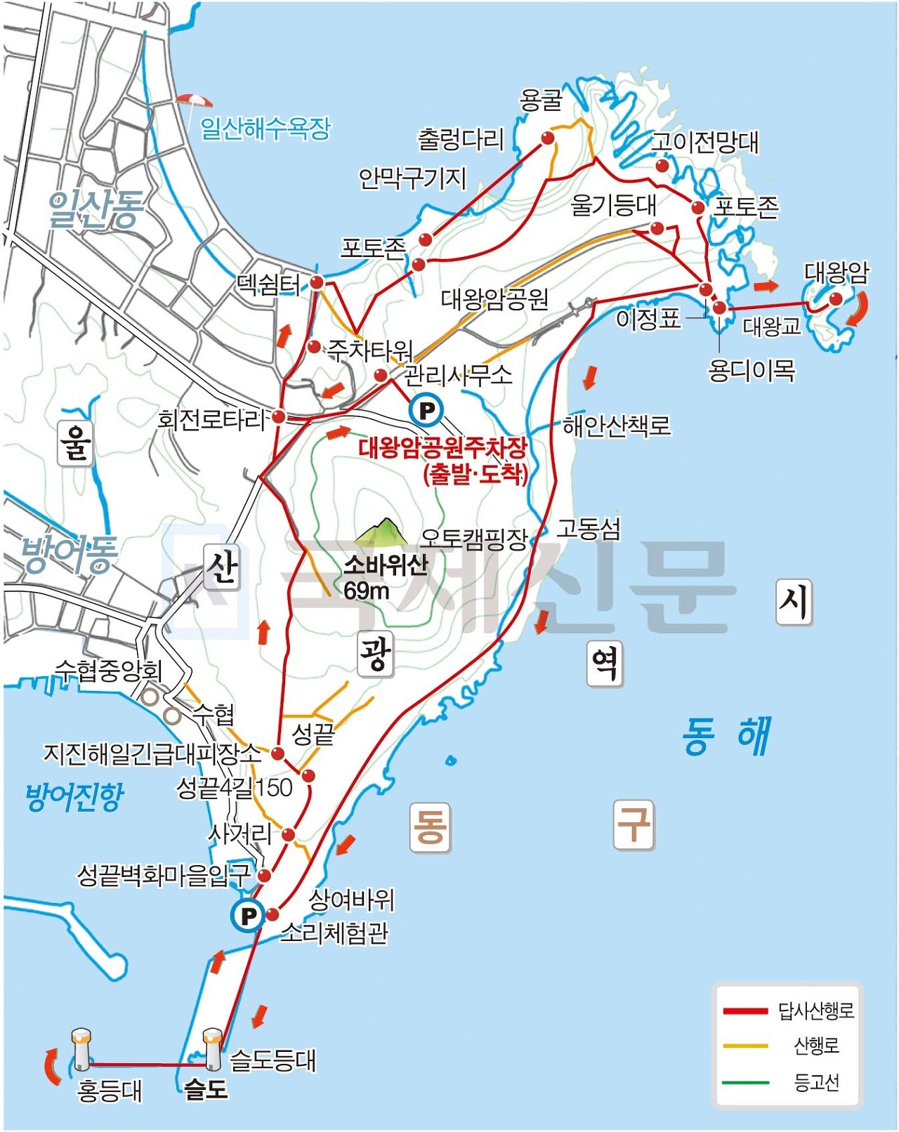 - “사근방(사근바위)”전망대-대왕암 광장-대왕교(출렁다리)
