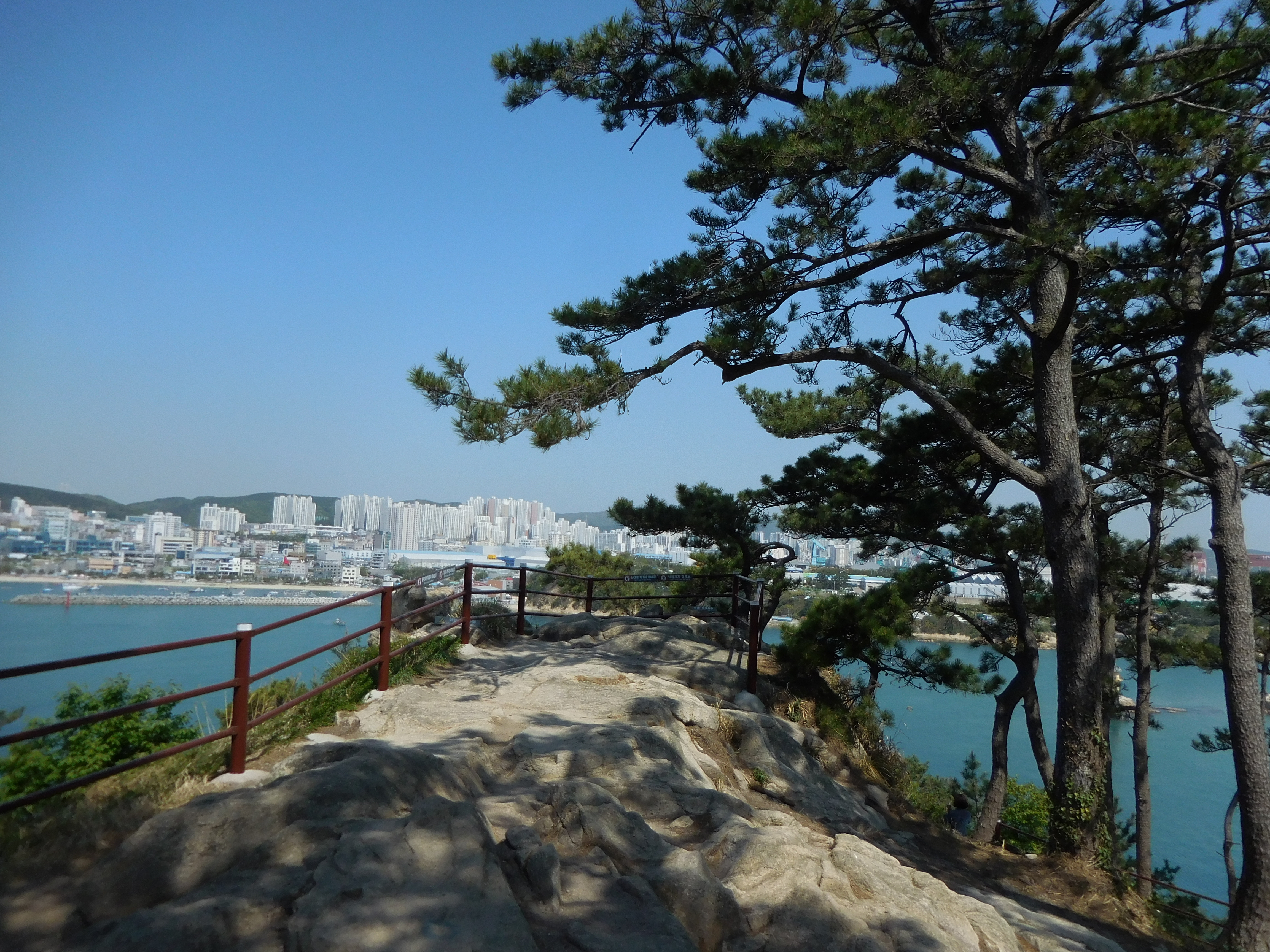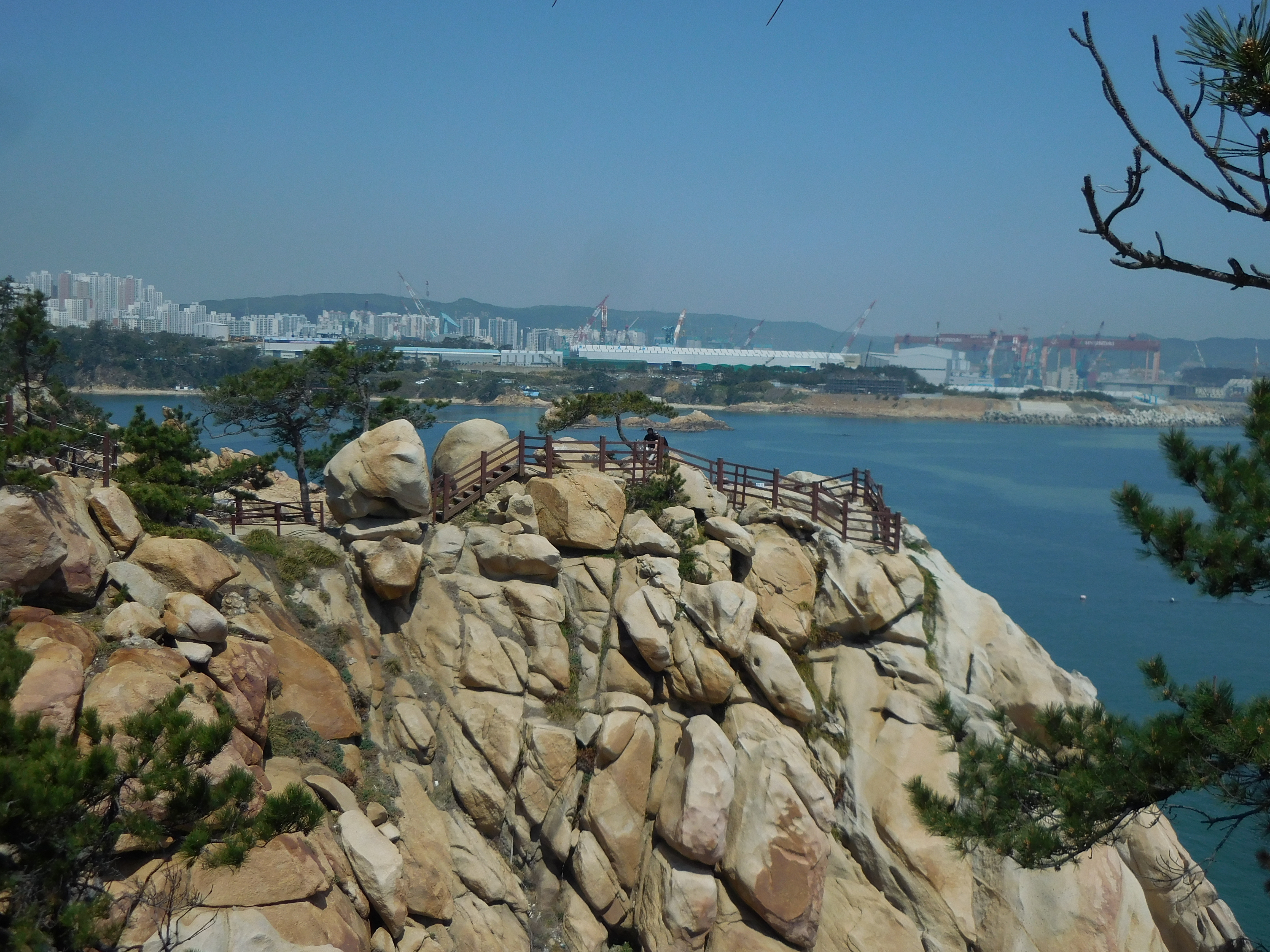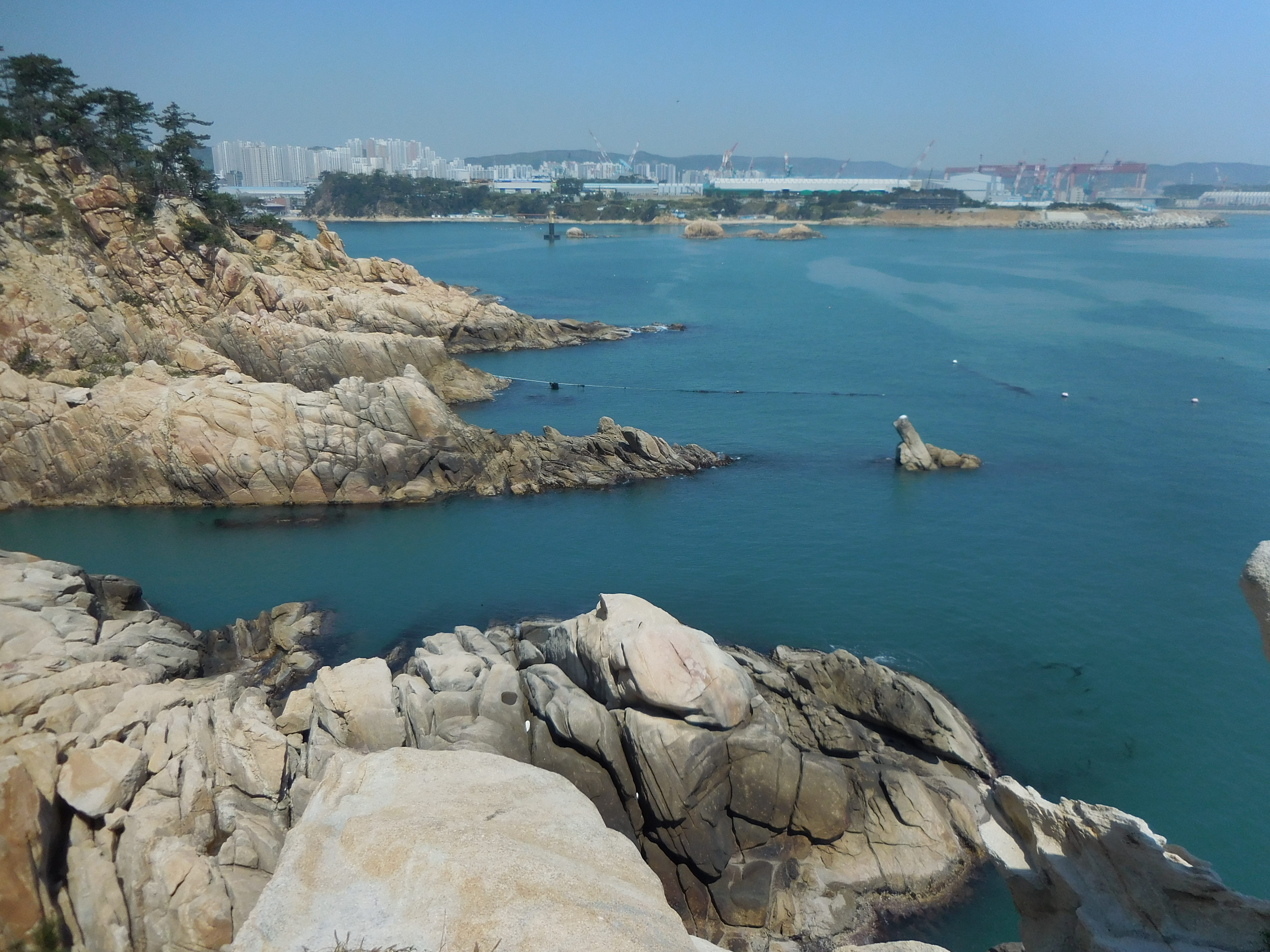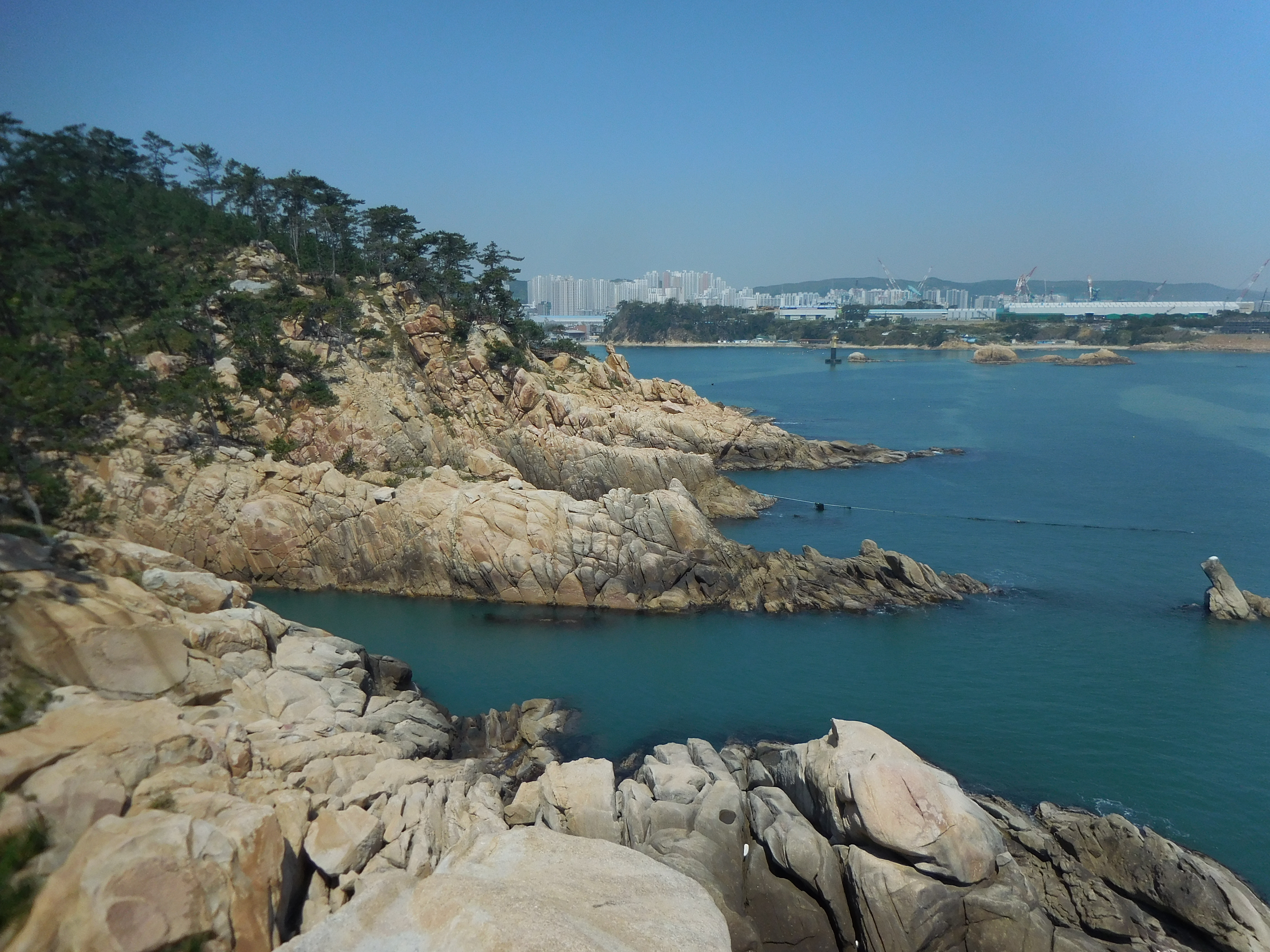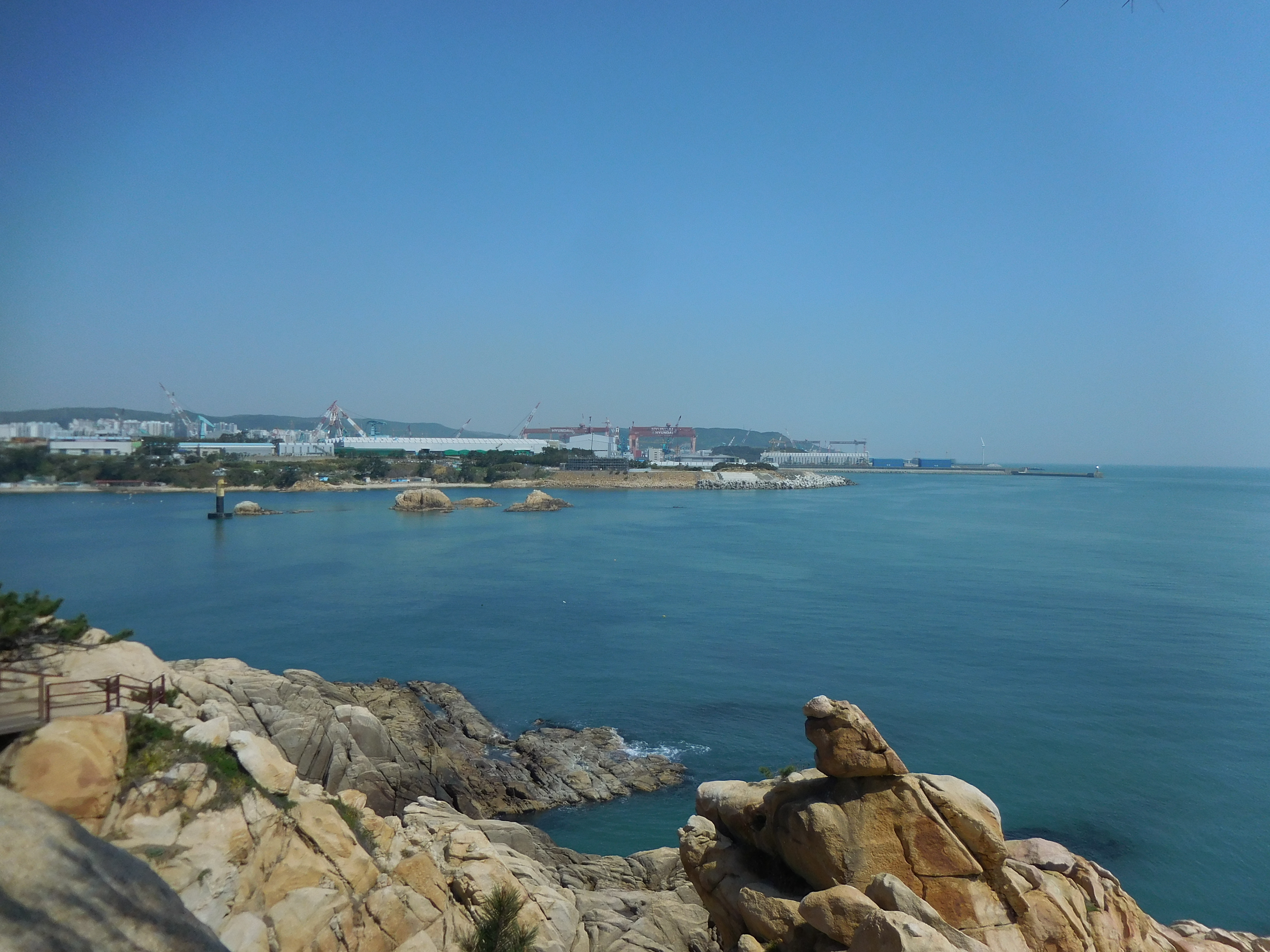 전망대에서 조망. ▲앞의 일산해수욕장과 우측의 ▼현대중공업 앞바다의 두개의 섬 민섬