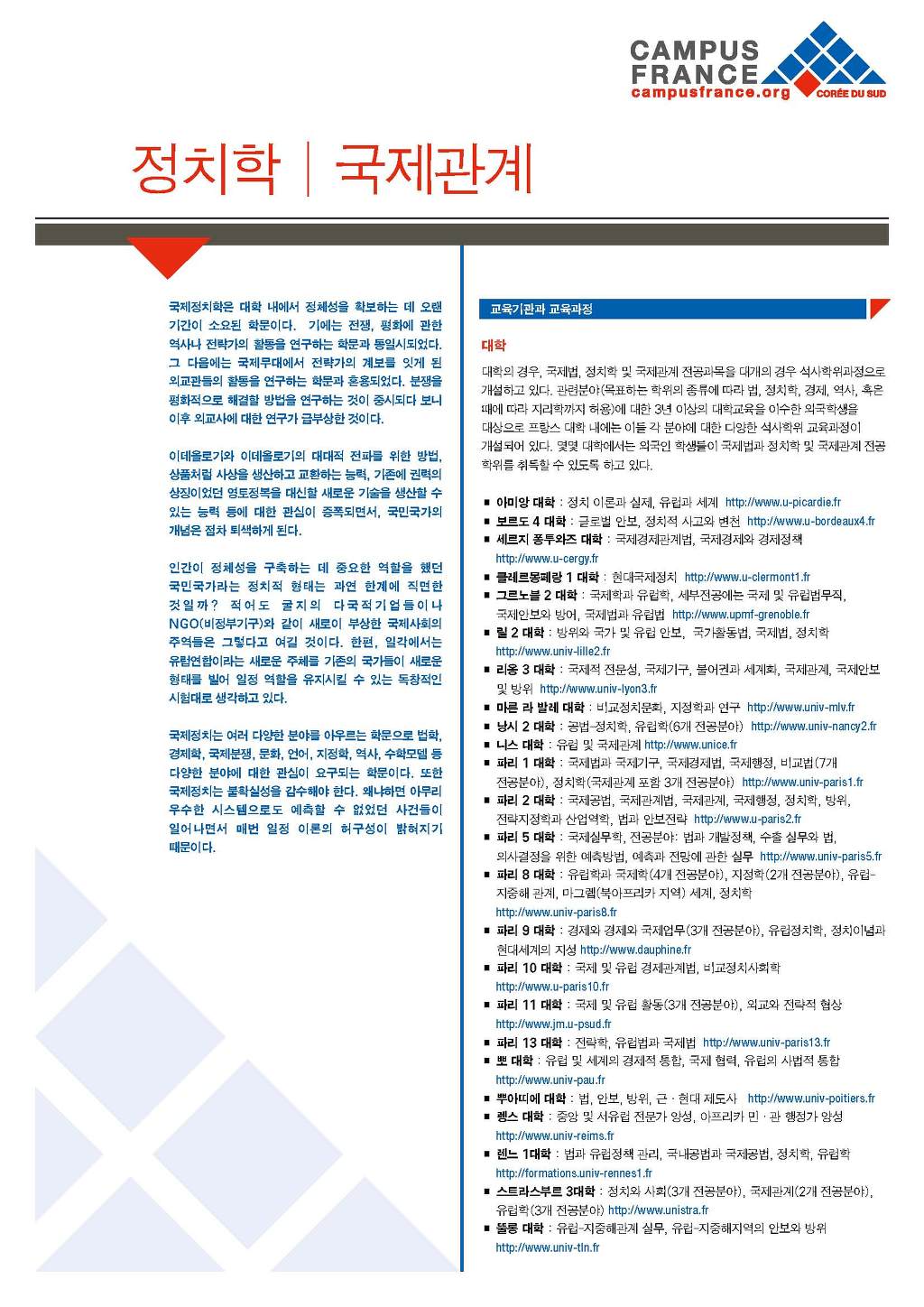 정치학 국제관계학 <프랑스 유학자료실> 작성자소피아|작성시간10.07.30|조회수349 목록 댓글 0 글자크기 작게가 글자크기 크게가 < 출처 : 주한 프랑스 대사관 교육진흥원 > 다음검색 현재 게시글 추가 기능 열기 북마크 공유하기 신고 센터로 신고 댓글 댓글 0 댓글쓰기 답글쓰기 댓글 리스트