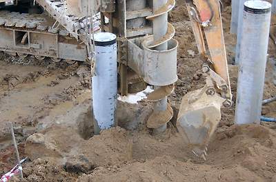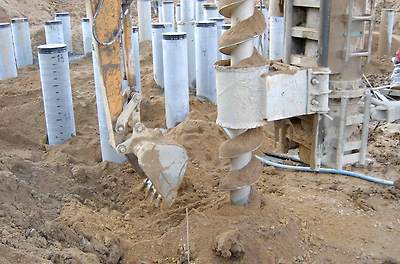 시공기계의 이동하는 지반의 강도를 확인한다. 필요하면 철판사용,지반개량등의 처리도 검토한다. 일반적으로 3점식 항타기에서는 접지압 10~20tf/m2 정도로서 그것에 대해 충분한 지반지력이 필요하다. |