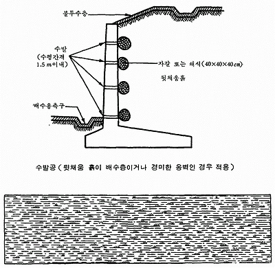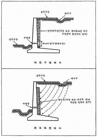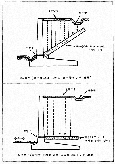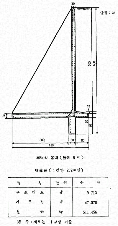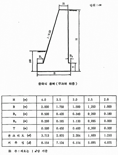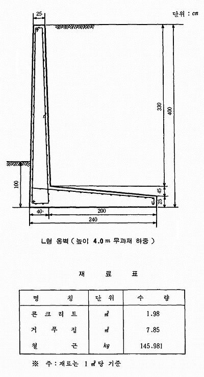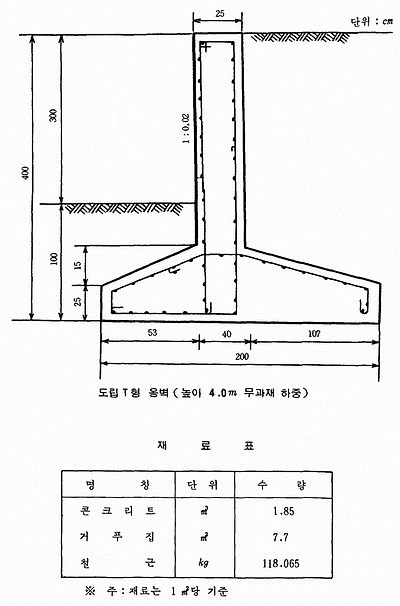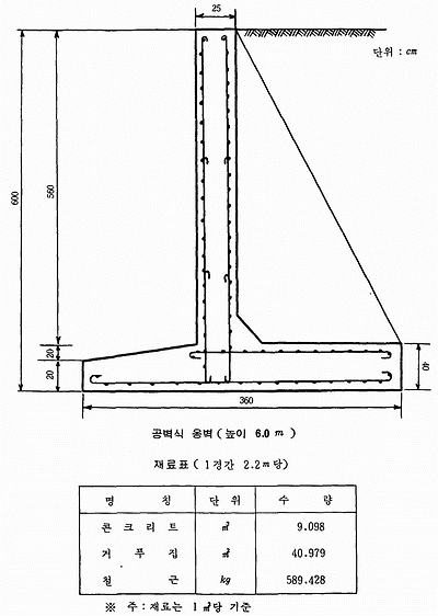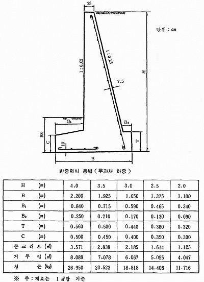 옹벽 설계 및 시공 관리 요령 작성자최현기|작성시간07.03.14|조회수2,238 목록 댓글 8 글자크기 작게가 글자크기 크게가 1. 옹벽의 종류 1.1 중력식 옹벽 (1) 옹벽자체의 자중이 크므로 기초지반이 비교적 단단한 경우에 적용한다. (2) 벽체의 자중에 의해서 전도에 견딘다. (3) 보통 높이 4m정도까지에 사용된다. 1.2 반중력식 옹벽 중력식 옹벽에서 콘크리트 사용량을 적게 하기 위해서 철근을 사용한 것이다. 1.3 L형, 도립T형 옹벽 (1) 옹벽의 자중과 뒷채움 흙에 의해서 전도에 견딘다. (2) 저면 반력을 적게하려는 경우 골재가 비싸서 콘크리트량을 감소시킬 필요가 있는 경우에 사용한다. (3) 보통 높이 4~8m에 적용한다. 1.4 앞, 뒷 부벽식 옹벽 (1) 앞 부벽식 옹벽은 위 그림(1)과 같이 토압을 받지 않는 벽쪽에 지지벽(부벽)을 설치한 옹벽이다. (2) 뒷 부벽식 옹벽은 위 그림(2)와 같이 토압을 받는 벽쪽에 버팀벽(공벽)을 설치한 옹벽 2. 옹벽의 설계 (1) 전도에 대해서 안정하게 (2) 활동에 대해서 안정하게 (3) 기초지반에 작용하는 최대압력이 지반의 허용지지력을 초과하지 않도록 - 안정성 검토는 공사 착수전 전문기술자와 상의할 것. 3. 옹벽의 표준단면(예) 4. 배수처리 4.1 배수의 중요성 옹벽 뒷면에 흙에 우수가 침투하면 뒷채움 흙이 포화상태가 되어서 강도를 감소시키고 토압을 증대시키며, 정수압이 뒷면에 가해져서 큰 압력을 옹벽에 작용시키게 된다. 4.2 옹벽에 영향을 미치는 물 (1) 옹벽 뒷면 또는 앞면에 내린 우수가 직접 흙속에 침투하는 것. (2) 배후의 산지에 내린 우수가 옹벽 배후의 뒷채움 토사표면에 유출한 것. (3) 산지의 우수가 옹벽 배후에서 용출하는 것. 4.3 배수처리 방법 (1) 표면수가 흙속에 침투하거나 흙을 세굴하지 않도록 지표면에 불투수층을 설치하고 지표면수를 옹벽에 영향을 미치지 않는 곳으로 유츌시킨다. (2) 흙속으로 침투한 물이 옹벽 뒷면에 머무르지 않도록 집수하여 유출시킨다. (3) 배수처리의 예 다음검색 현재 게시글 추가 기능 열기 북마크 공유하기 신고 센터로 신고 댓글 댓글 8 댓글쓰기 답글쓰기 댓글 리스트 작성자세도 | 작성시간 09.02.13 좋은 자료 감사합니다.. 작성자mbs1 | 작성시간 10.11.10 좋은자료 고맙습니다. 작성자최광무 | 작성시간 12.03.17 감사해요 작성자주홍글씨 | 작성시간 12.06.10 잘 보고 쓰겠습니다 감사 작성자마포숭문고/ 인하대/(주)삼호 | 작성시간 12.10.15 감사해요 댓글 전체보기