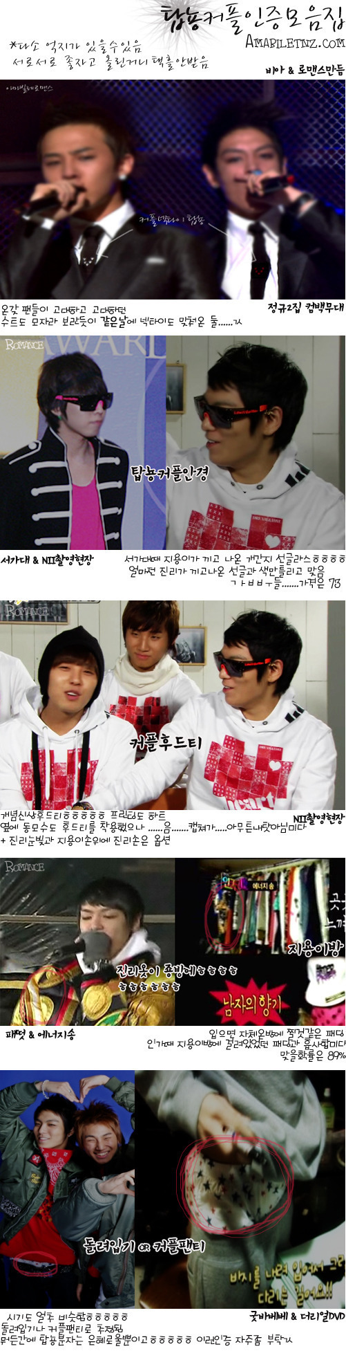2011.6.20이후 적용 자세한사항은 공지확인하시라예 출처: 여성시대 pinot noir, 네이버블로그 순늉, 꽃녀토리, 로망 요즘 욕망방에 주거니받거니 치열하게 배틀뜨는 두 망붕의 요소들 데려왔음 ~^~^~ 요즘 탑뇽글올려주는 언니가 빼박 정리글 쪄줘서 탑뇽러들+다른 팬언니들은 이미 망붕돋고있으니...ㅎㅎㅎㅎㅎ (나레기도 8년차 탑뇽러 ㅎㅎ 구치만! 이글에선 철저히 주관배제하고글쪄봄 ㅎ.ㅎ) 나 는 탑뇽 vs 뇽토리 빅매치만 붙여볼게 키키키킼ㅋ키ㅓㅋ헿ㅎㅈㅐ밋겟다 !!!!!!!!!!!!!!!!!! 씐↗난닼!!!!!!!!!!!!!!!!!!!!! 먼저 탑뇽 탑뇽러들 요즘 속속들이 보이기시작 하긴... 떡밥이 넘쳐나는데 그것도 얘네는 더이상하게 은밀하고 비밀스럽고 함축스럽고 난리쟈나 망붕안되는게 이상한거아냐.. ? ;; (우리들이 망붕이아니라 이 둘이 현게일수도 ㅎ) 탑은 원래 김재중이랑 친분이있음 무슨무대인진 잘모르겠는데 퇴장때 둘이 속닥속닥 뭔 얘기를함 권지용 표정,입모양 "아 ㅋ허 ㅋ?참나 ㅋ' ㅋㅋㅋㅋㅋㅋㅋㅋ권지용씨 빡침.. ? ㅎ너무망붕돋나 너네 서로 쳐다보는 눈빛이 왜그럼 ? 권지용은 누가 자기옷 따라입거나 옷공유하는것도 별로안좋아하면서 유~독 최승현이랑은 서로 옷돌려입는일이 허다함 옷돌려입은 사진, 저 커플민트팔찌, 커플시계는 하도 인증샷이 많아서;;;; 생략..
