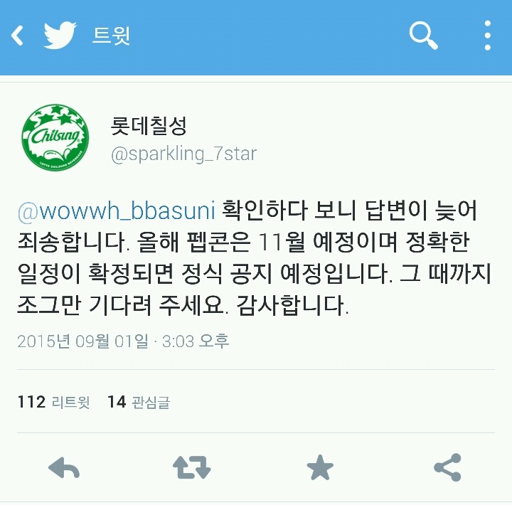 그리고 롯데칠성트윗 관계자가 펩콘은 수능끝나는즘에 할거라고했는데