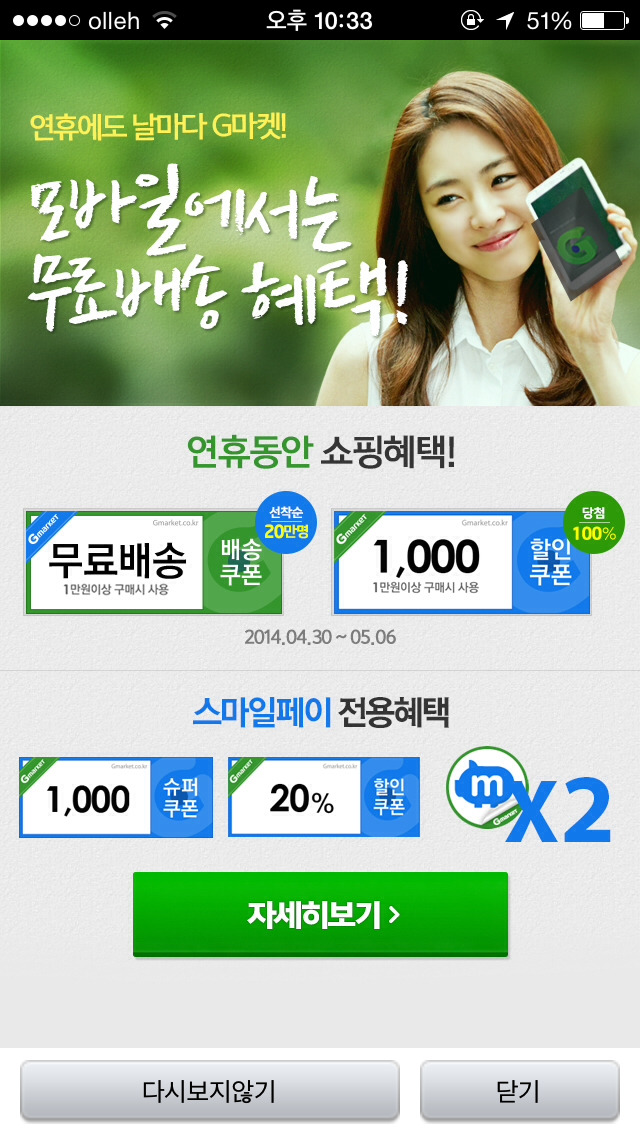 [[쿠폰세일정보]]쥐마켓 무료배송쿠폰 선착순 떴다!! 모바일앱! 작성자Zooey Deschanel|작성시간14.04.30|조회수5,033 목록 댓글 41 글자크기 작게가 글자크기 크게가 출처: G마켓 모바일앱난 방금받아땅 다음검색 현재 게시글 추가 기능 열기 북마크 공유하기 신고 센터로 신고 댓글 댓글 41 댓글쓰기 답글쓰기 댓글 리스트 작성자에녕! | 작성시간 14.05.01 고마워♥받았당 작성자갱 이 | 작성시간 14.05.01 고마웡!!!! 작성자얼린콩찰떡 | 작성시간 14.05.01 받앗당고마워!! 작성자아모르겟다 | 작성시간 14.05.01 받앗당 고마워~ 작성자안깐마늘. | 작성시간 14.05.01 오 나도받음!고마워! 댓글 전체보기