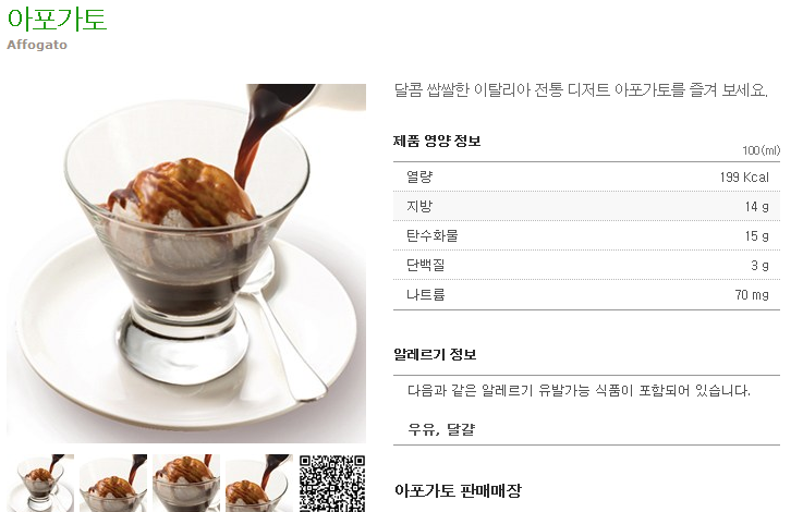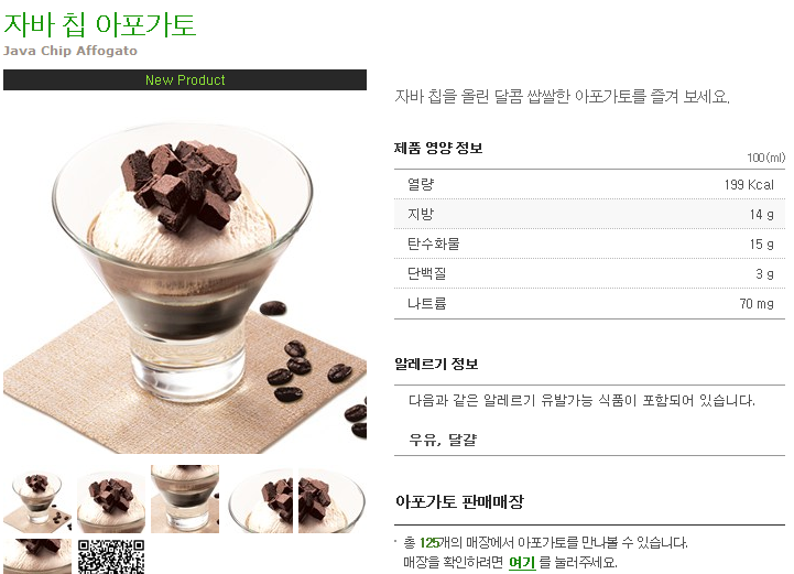청정 강원도 횡성의 친환경 목장, 범산목장의 유기농 우유로 만든 유기농 바닐라 아이스크림에 스타벅스 바리스타가 추출한 에스프레소를 붓고 자바 칩(초콜릿 칩)을 올린 디저트입니다.