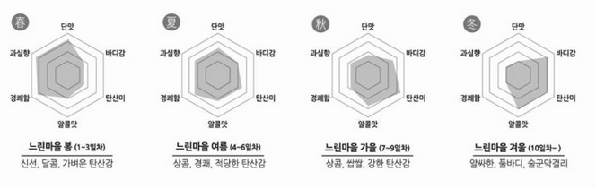 막걸리가 대체로 다 그렇지만 얜 특히 유통기한이 되게 짧음 그리고 제조일에서 며칠 지났는지에 따라 맛이 바뀜(아래그림)