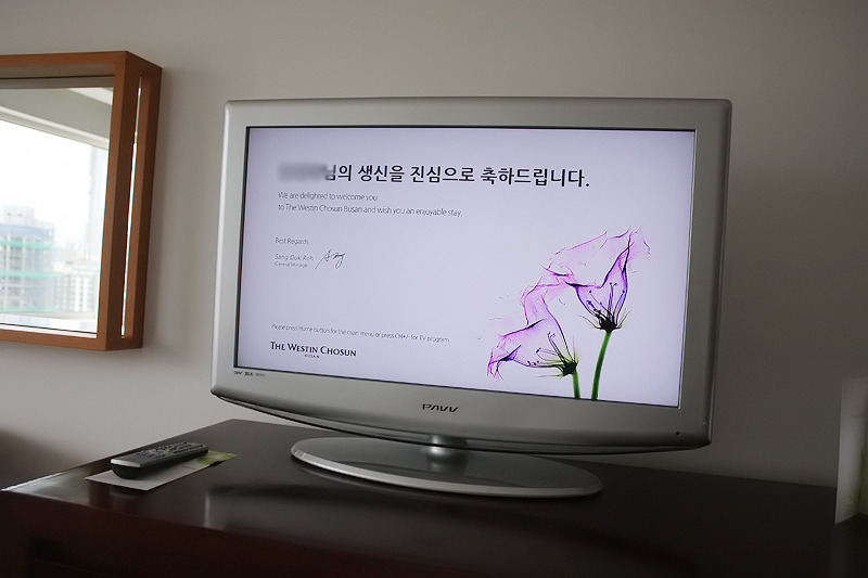 이거는 침대쪽에서 찍은 책상과 티비샷.. 티비에 써있는건 웰컴메세지!