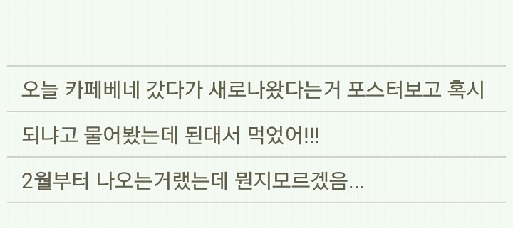 작성자SHINee 최민호 작성시간 15.01.29 베네 알바 참고하고 갑니다 쫑쫑ㅋㅋㅋ 오늘 시식하니까 먹어보고 후기남길수있으면 남기겠슝ㅎㅎ