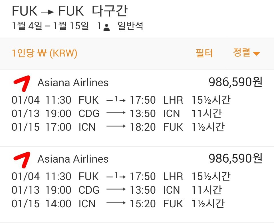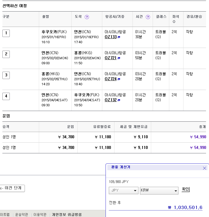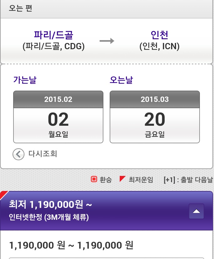 이건 내가 아시아나 공식 홈페이지에서 조회해봤던 인천-파리 왕복 항공권이야