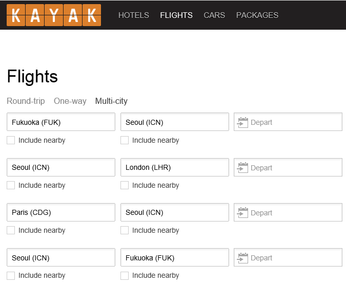 예매를 하는고야! 내가 아래 든 예시는 후쿠오카-인천/인천-런던/파리-인천/인천-후쿠오카의 총 네 여정!