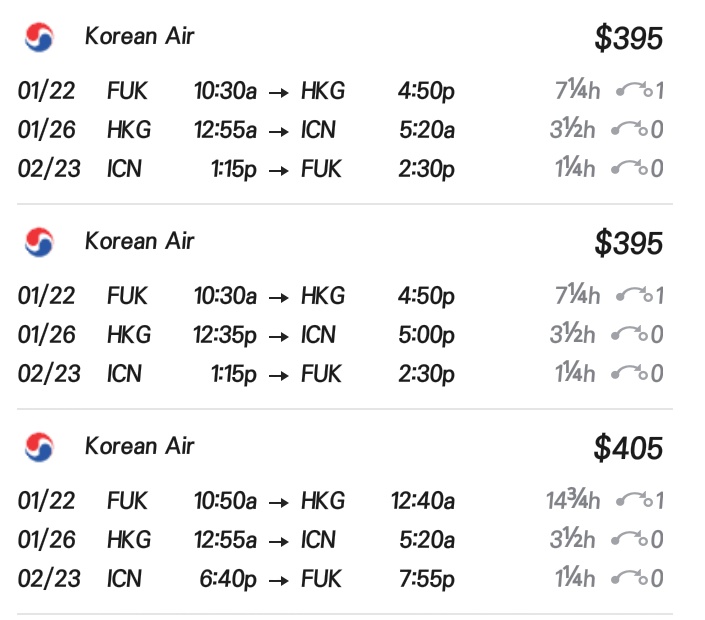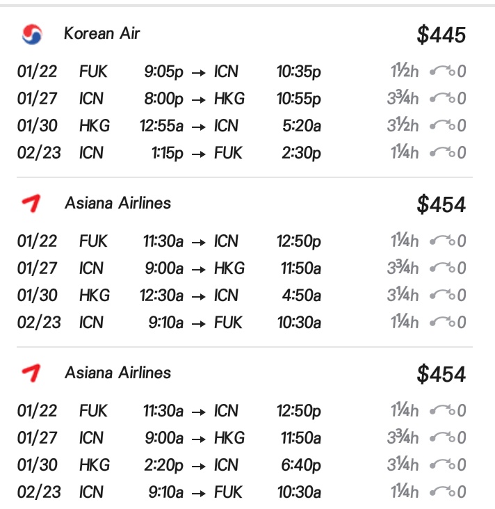 국적기 기준으로 봤을때 아시아나는 일본 출발이, 대한항공은 홍콩 출발이 더 저렴한 걸로 알고 있어!