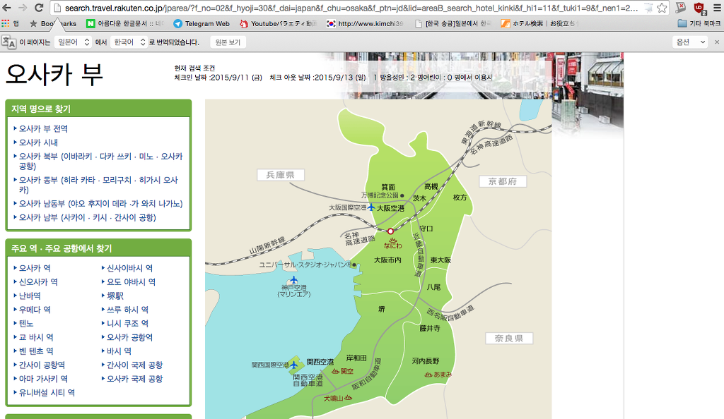 오사카는 킨키 지방이야 그래서 킨키를 누르면 오사카가 뜸! 그거 누르면 돼.