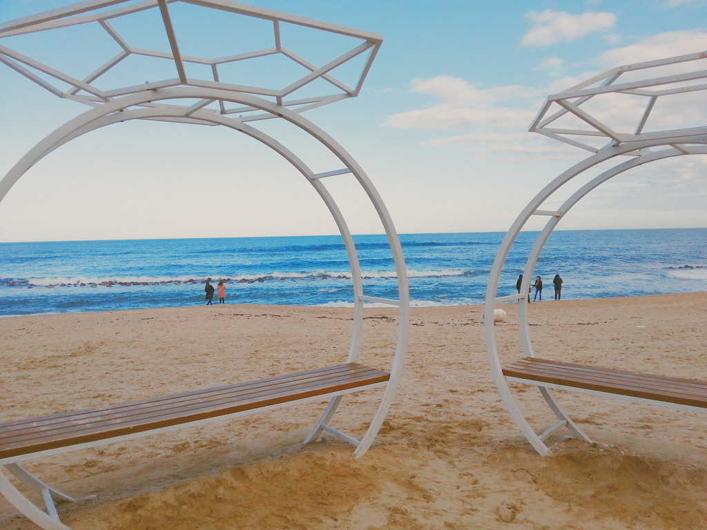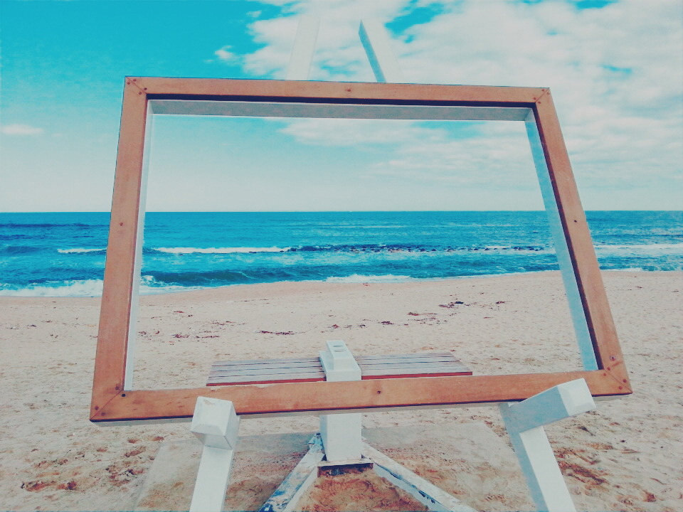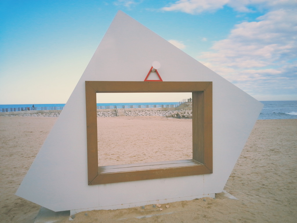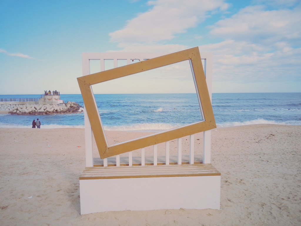 강문해변엔 커플이 넘나 많고요.. 짐도 무겁고 다리아파서 액자 의자에 앉아있는데 누군가 지금 사진찍으실꺼냐고 묻더라...