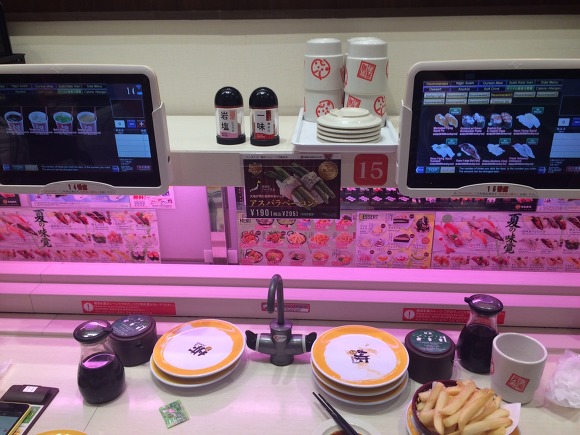 앉아서 모니터로 먹고싶은거 띡띡띡 주문하면 레일로 스시가 띡 도착하는 데가 있는데