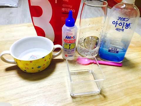 pva물풀,아이봉,소다,깨끗한물,섞을거,그릇두개