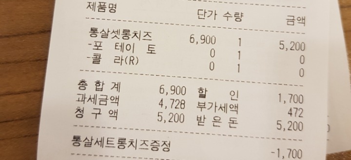세트는 치즈스틱 포함 5200원