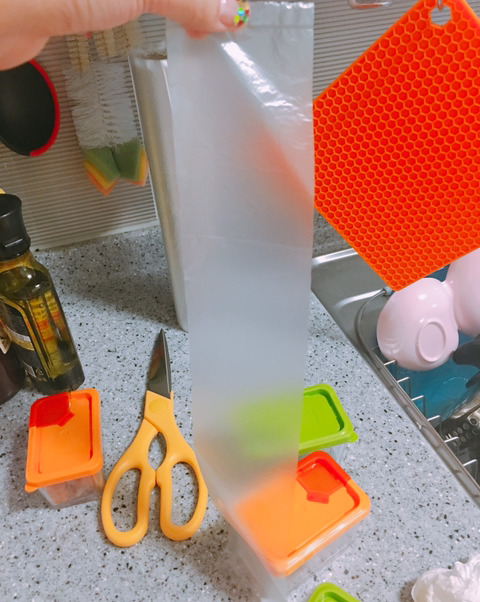 1. 위생 비닐을 소스통 사이즈에 맞춰 자른다