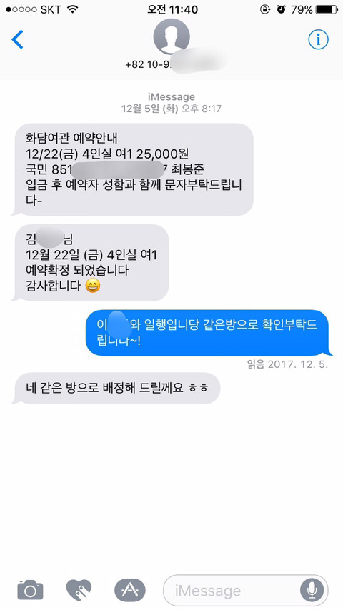 다 따로따로 잡았는데 같은방으로 해달라고했더니 해주셨옹