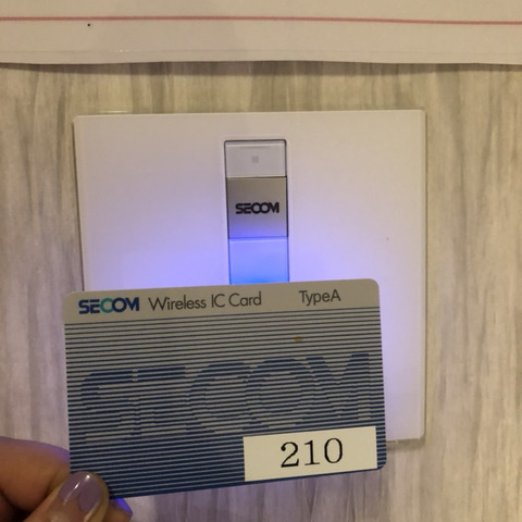 이렇게 카드키를 대야만 2층으로 가는 버튼을 누를 수 가 있어 여성층에만 이렇게 시큐리티 카드가 있다고 해! 분실하면 2000엔을 내야하니 조심하고!!