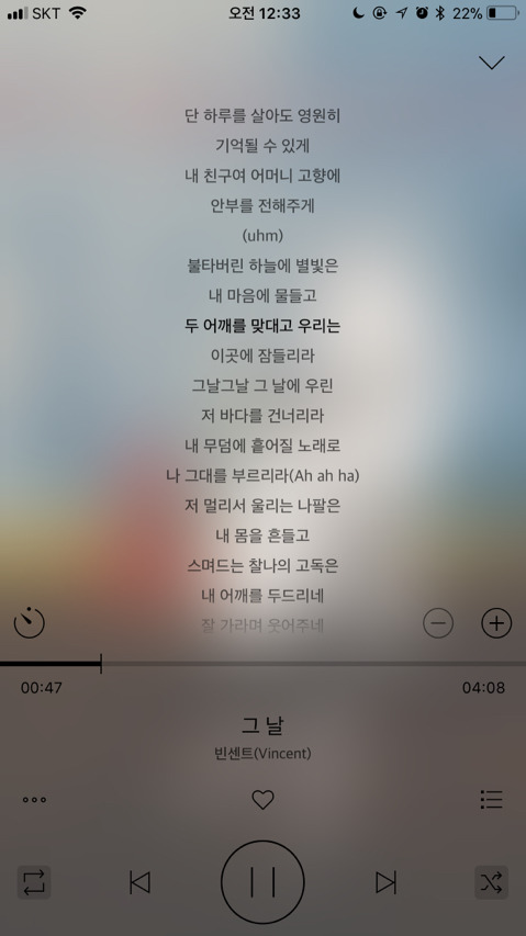 이건 이별노래이긴 한데 피아노 소리랑 종현 목소리가 너무 서글프면서 아름다워서 새벽에 자주 들어