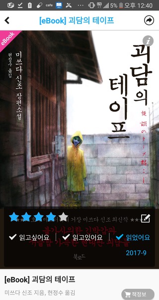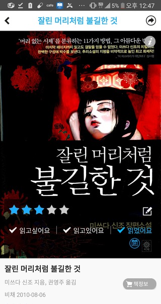 갠평 : 무서워.... ㅎㅎ 6편의 괴담이 들어가있는데 액자식 구성이라서 괴담밖의 테이프를 듣는 나한테도 기이한 일들이 일어나...흑흑.. 무섭다는 말 밖에는 할 말이 없네. 사실 인간이 생각할 수 있는 괴담이란게 겹치기때문에.. 뻔하지만 .. 공포영화도 뻔한 맛에 보잖아요?? 나와야 할때 나와주고..그럽니다!!! 이 책은 추리적인 성격보다는 괴담 성격이 더 큽니다.