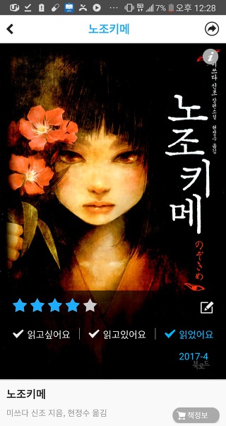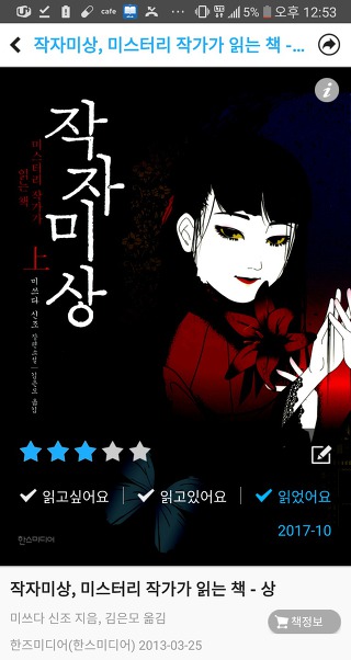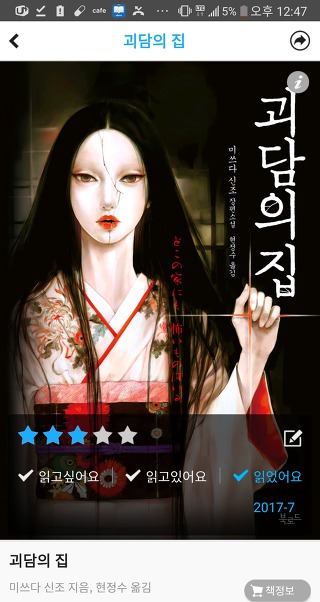 갠평 : 졸라 무서움 ㅜㅜ 문틈에서 누가 쳐다보는 거 상상만 해도 무섭잖아. 인간 본연의 공포잖아.... 그런 얘기가 졸라 나와서.. 나는 밤에 보다가 무서워서 그만보고 다음 날 낮에 봤어!!!!!!!!!!!!!!!!!!! 책 읽으면서 무서움을 느낀 건 검은집 다음 이 책이 첨이야....이 책은 추리 50 + 괴담 50