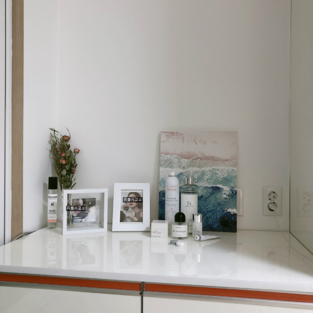 그리고 선물받은 꽃다발 잘 말려서 세워 두고 그림이랑 강아지(수정함) 사진이랑 기초제품만 올려두고 써