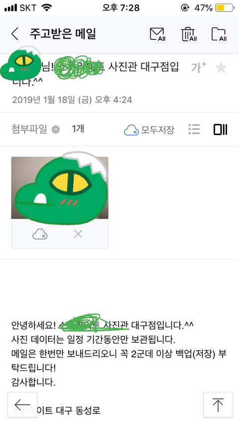직원이 이런 경우가 많아서 각자 사진 다 찾아가면 메일로 따로 통지를 해준다고 메일 받은거 없냐 ? 고 물었는데 우리측에서는 처음 사진 찾을때 원본 사진 보내준 저 메일 말고는 없거든 ; 그리고 사전에 그런 공지도 없었고ㅋㅋ..