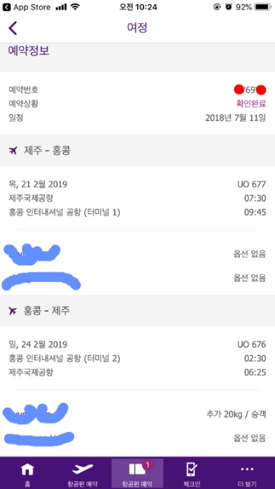 나혼자 홍콩에서 제주도로 편도기내수화물 추가도 했어 38,500원.