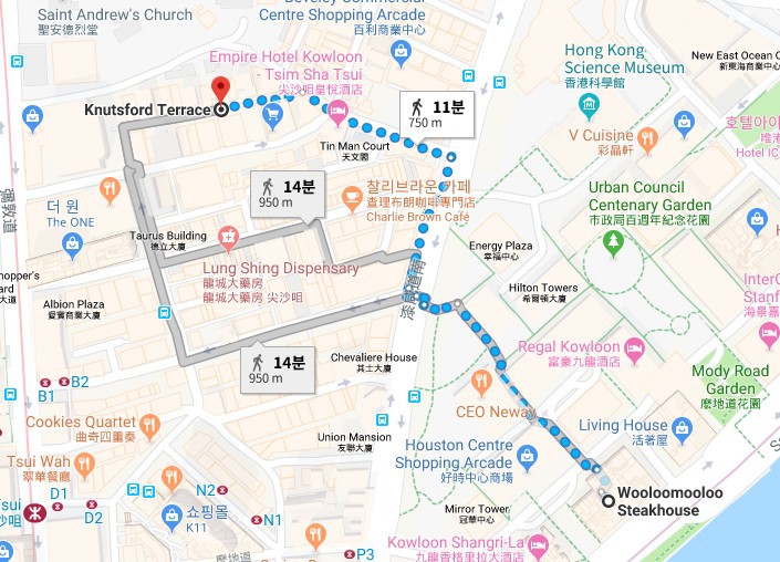 택시를 잡아타고 침사추이 이스트에 있는 울루물루 스테이크하우스에 갔어.