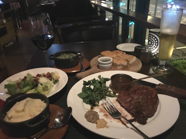 울루물루스테이크를 시켰고, 크림 스피니치와 매쉬드포테이토, 작은 샐러드를 사이드로 시켰어. 그리고 멜롯도 한잔 추가.