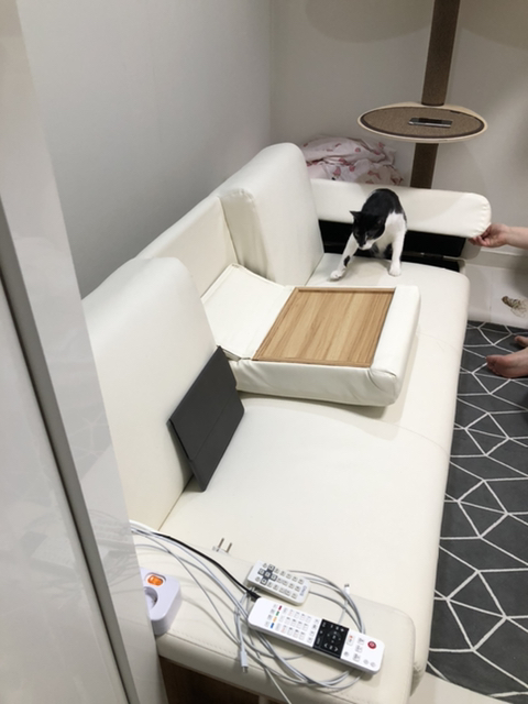 이건 가운데 테이블 내렸을때. 쿠션이 있어서 그런지 딱 수평이 아니라 위에 뭔가 올려놓으면 뒤로 밀려나더라. 테이블로 쓰려면 미끄러지지 않게 할 뭔가 필요해.
