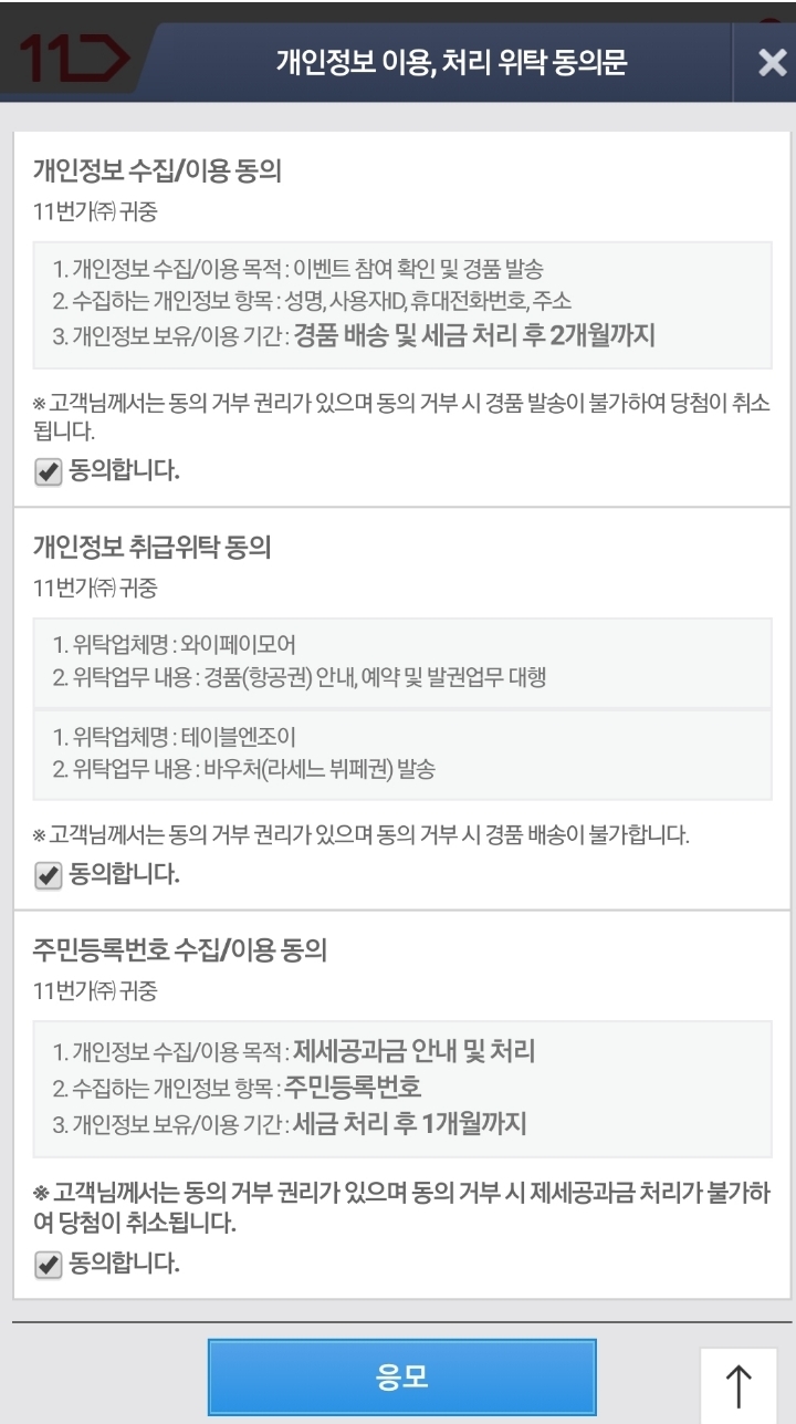 내용 동의 후 응모를누르면 바로 결과가 나와