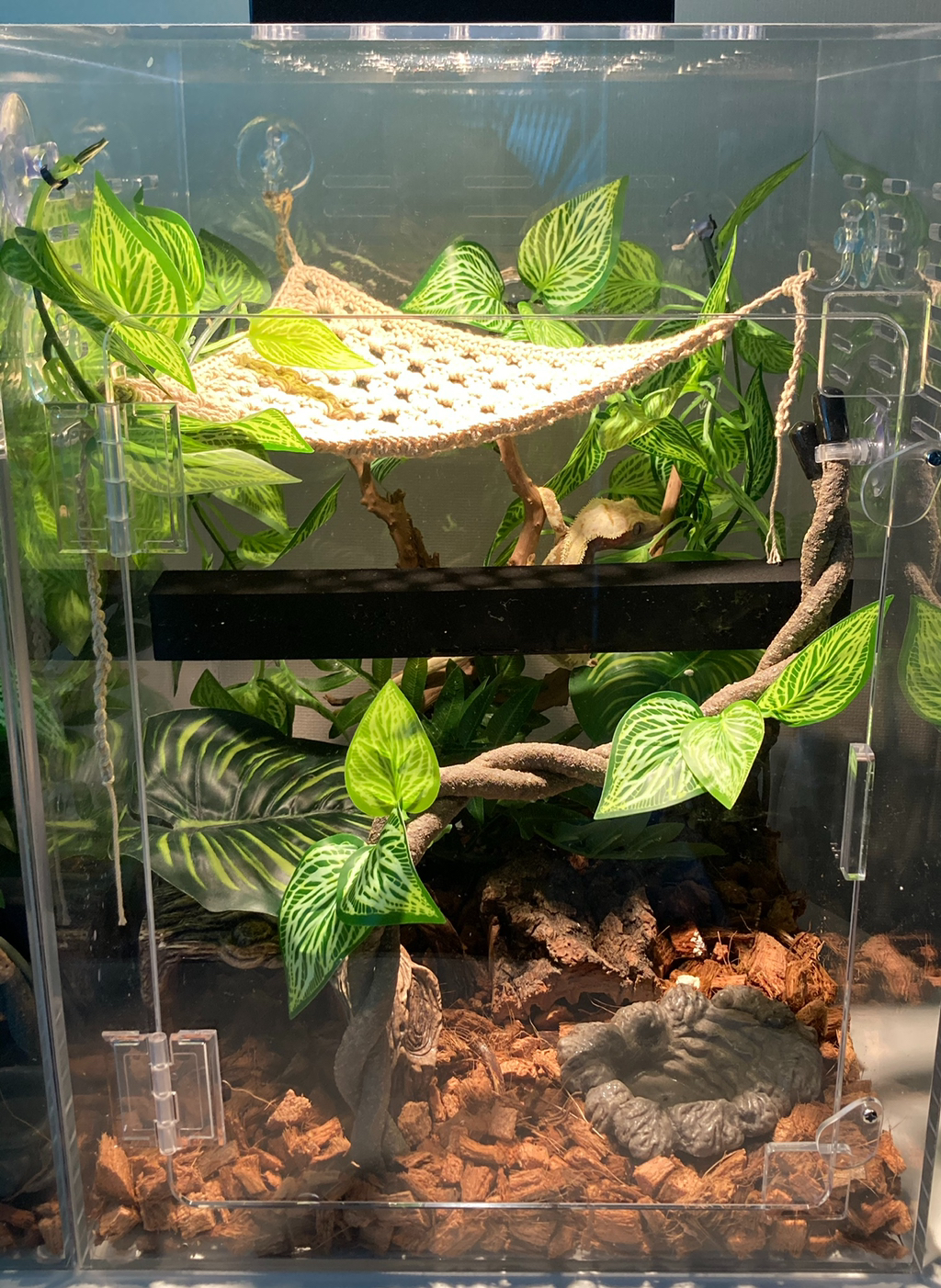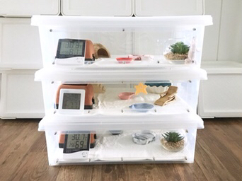 햄스터 리빙처럼 높이가 낮고 가로로 긴 리빙을 직접 전면개조해서 아주 잘 쓰고 있어. 바닥에는 애견패드 깔고 습식은신처(탈피를 도와줍니다) + 건식은신처랑 먹이그릇, 온습도계 이렇게 간단하게 넣어놨어