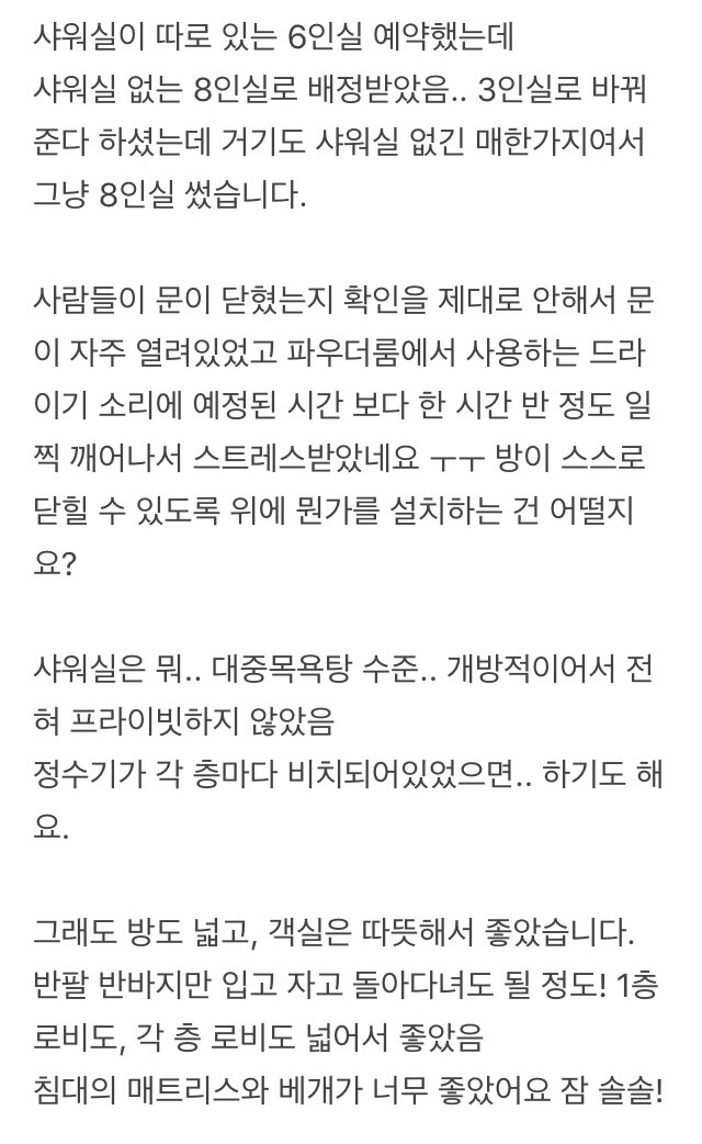 여자가 쓸 수 있는 침대 수가 20갠데 샤워부스는 세 개뿐이라 사람 많을 땐 혼잡이 예상..ㅎ 나랑 다른 여자분 샤워시간 겹칠 때도 불편했거든 ㅎㅎ..
