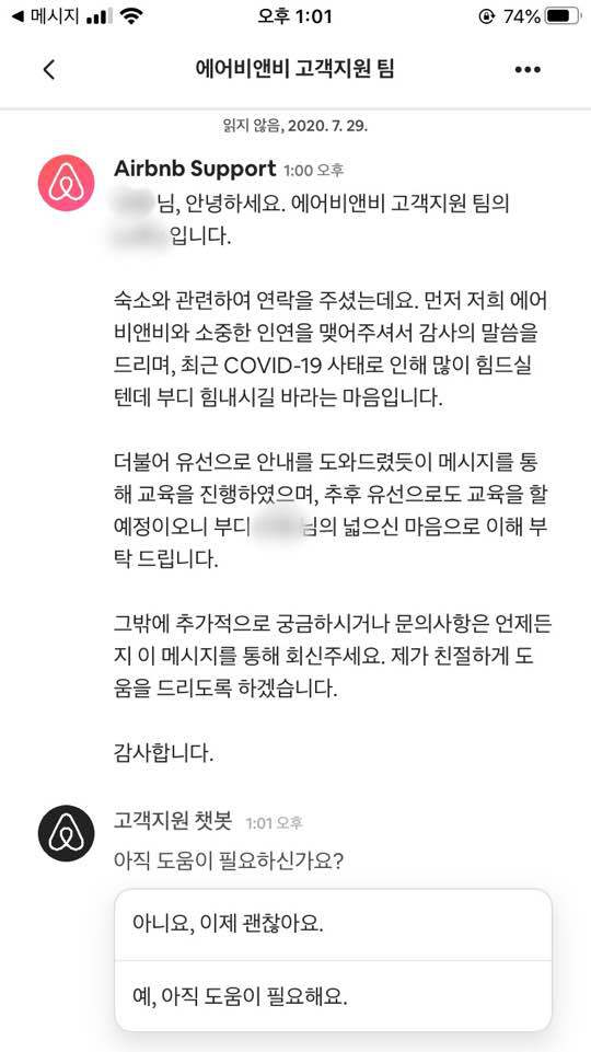 에어비앤비 측에서 이 일에 대한 어떤 추가적인 조치를 해줄 수 없다는 답변을 받았어.