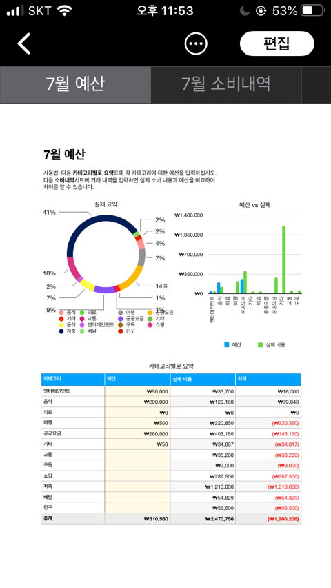 원래는 소비내역, 예산 이렇게 돼 있는데 내가 7월을 달아줬어 시트 추가도 되니까 옆에다가 시트 추가하면 8월도 똑같은 형식으로 쓸 수 있을 거 같어