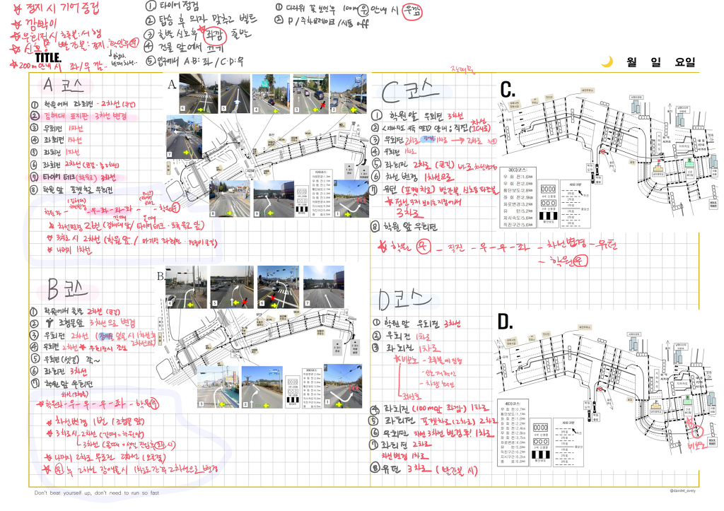 - 첫 번째 우회전: 1차선으로 들어간 후 2차선으로 변경 (불법주정차 때문)