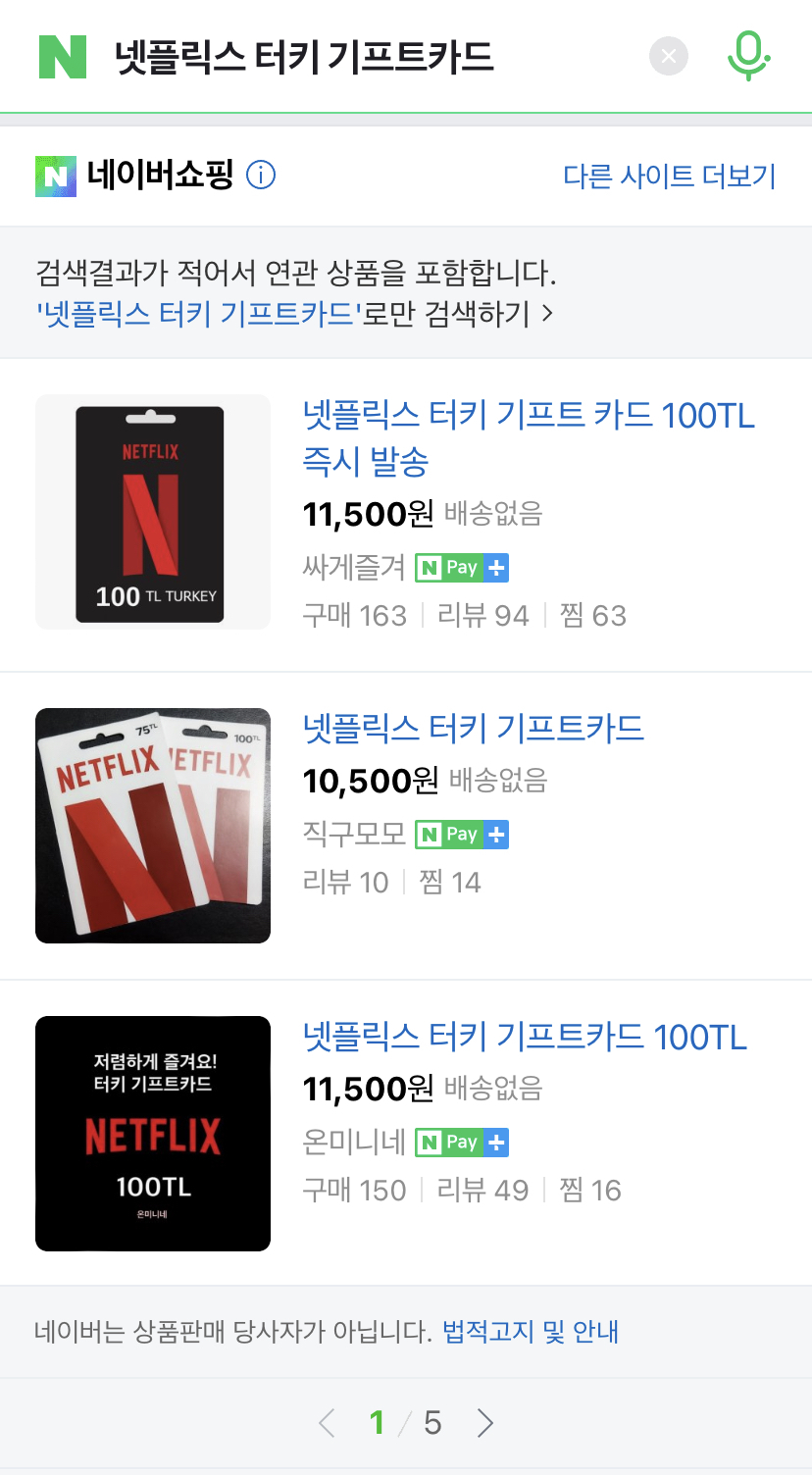 1. 네이버에 '넷플릭스 터키 기프트카드' 를 검색하면 여러 스마트스토어가 뜨거든. 여기서 가격 비교해봐서 가장 저렴하다고 생각하는 곳에 들어가면 돼.
