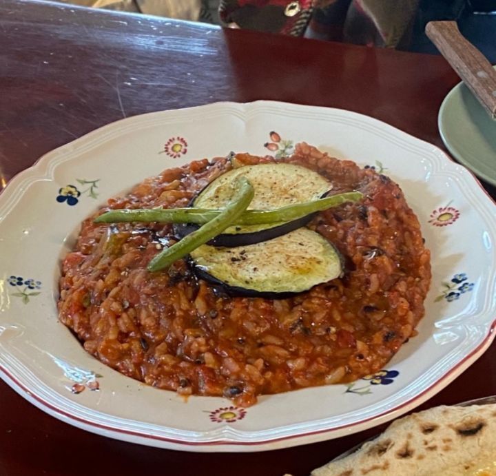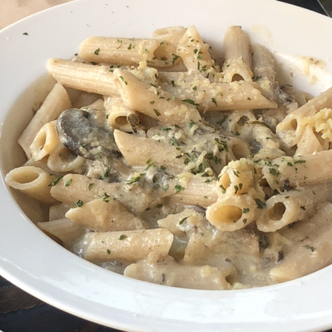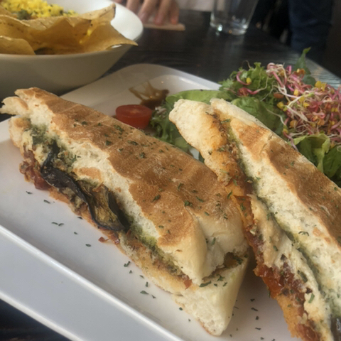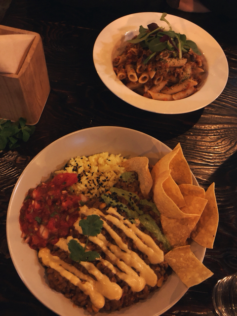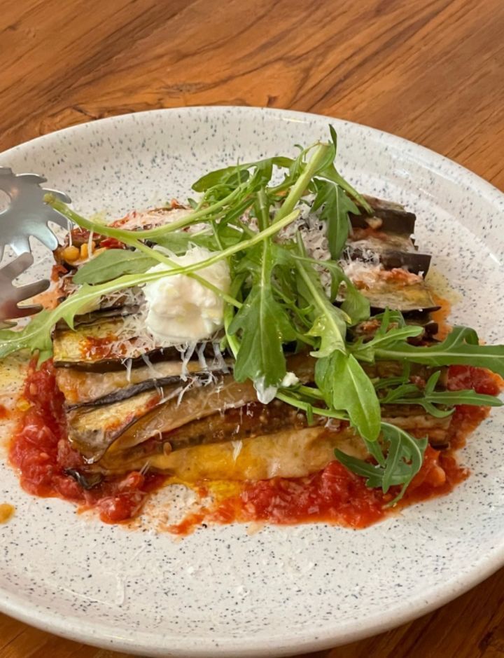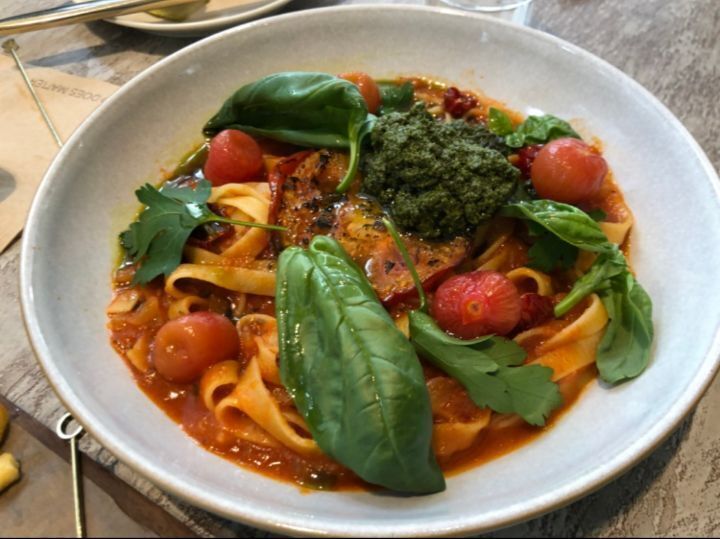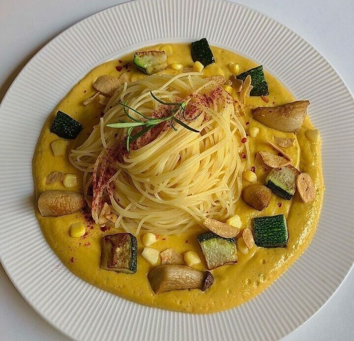 비건 프랑스식 식당. 파스타, 라자냐 등