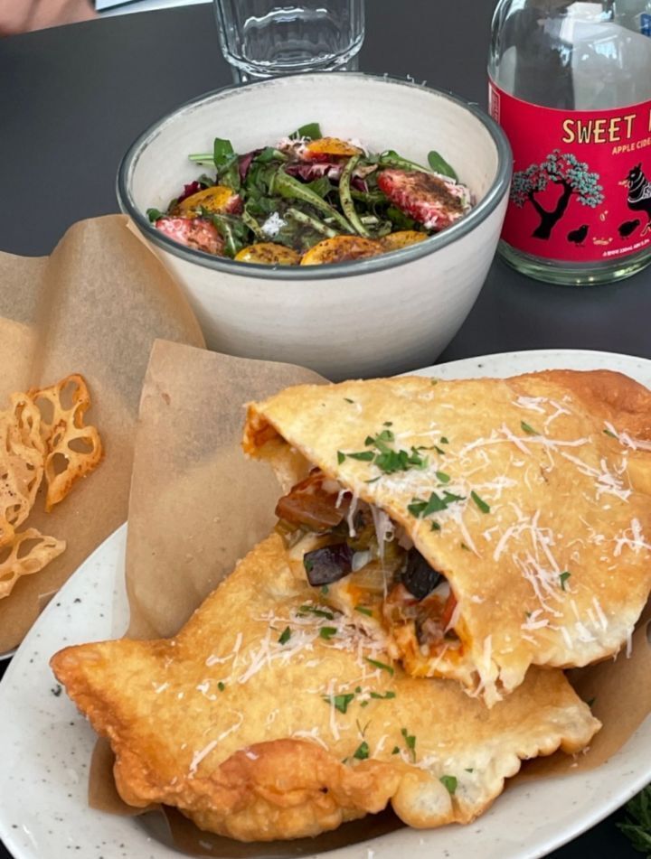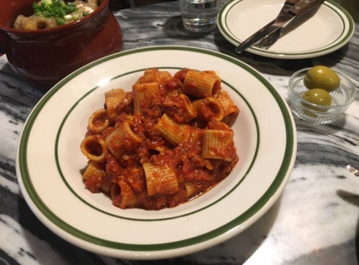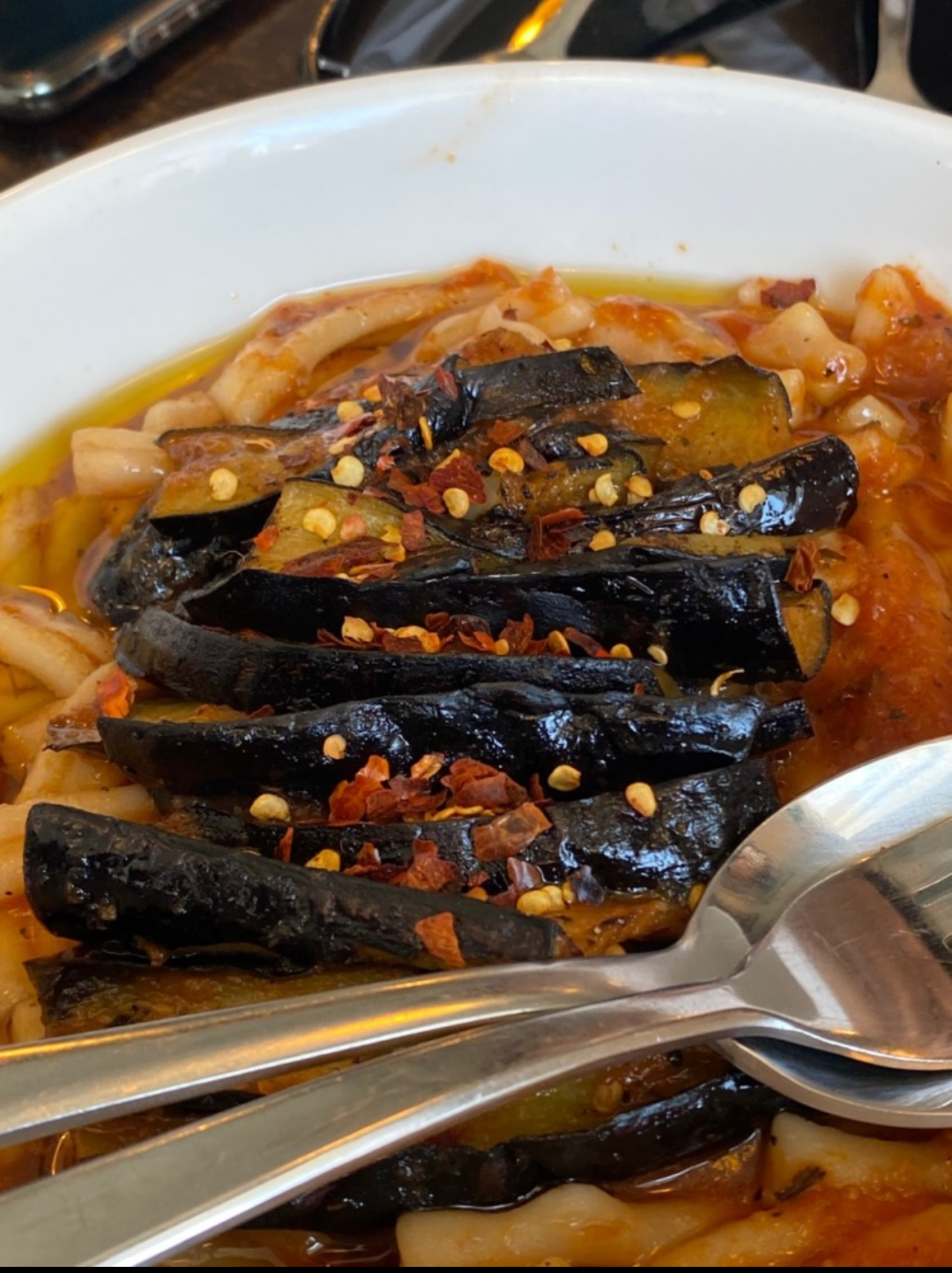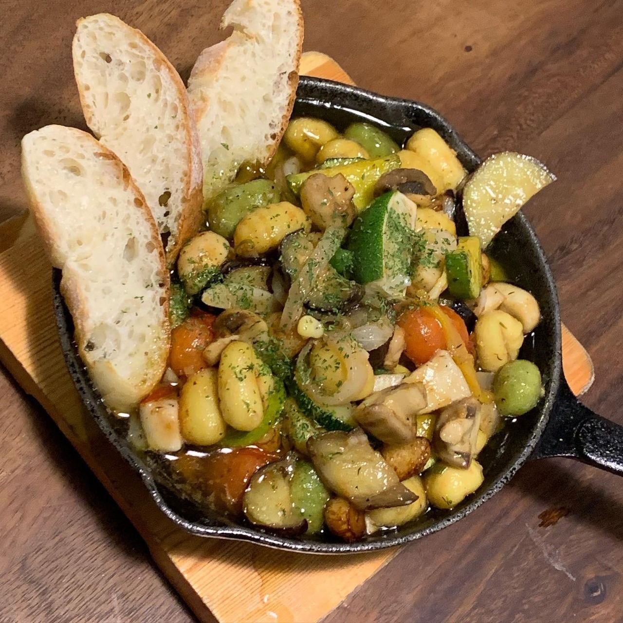 비건 프랑스식 식당. 파스타, 라자냐 등