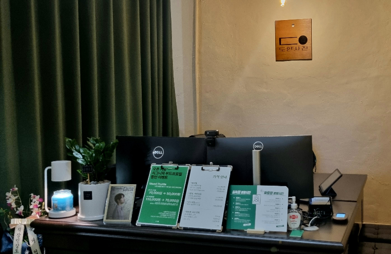 -사진 찍는 걸 워낙 어색해 하자 사장님이 오히려 웃으시면서 "사진 찍는 게 많이 힘드시면~" 하시면서 있는 소품을 어떻게 활용하면 좋을지, 보통 어떤 구도로 사진을 많이 찍곤 하는지 안내해 주셨음. 도안사진과 마찬가지로 여성 사장님 두 분이 운영하시는 것 같았는데, 불편한 질문도 전혀 없었음.
